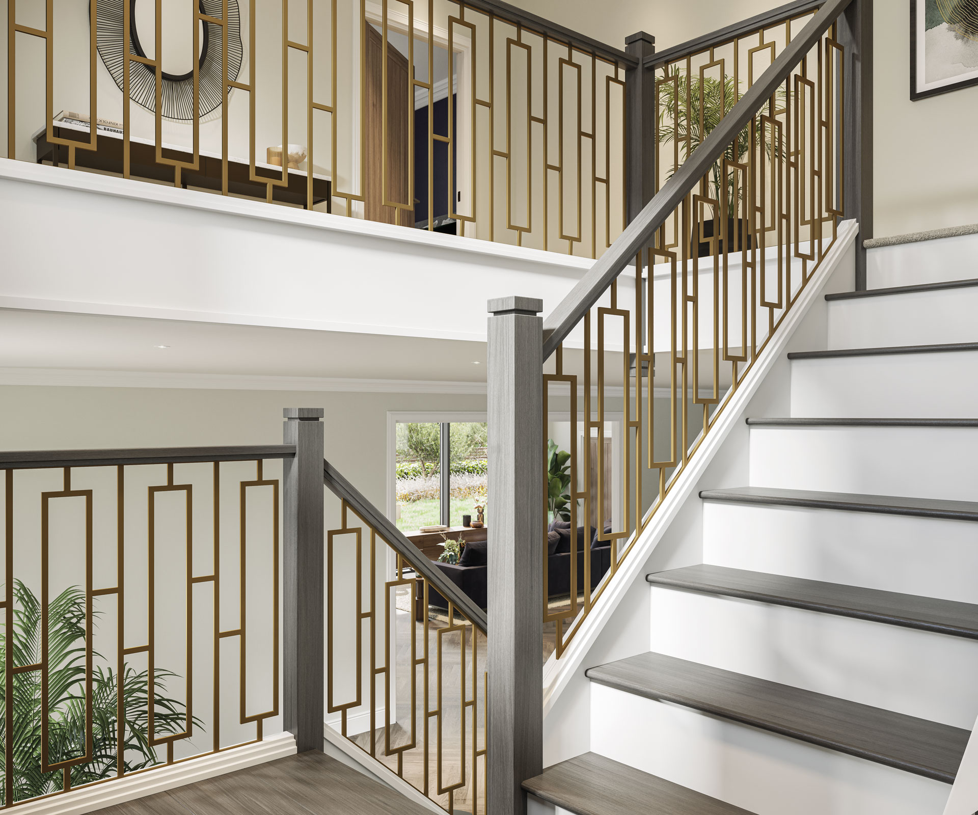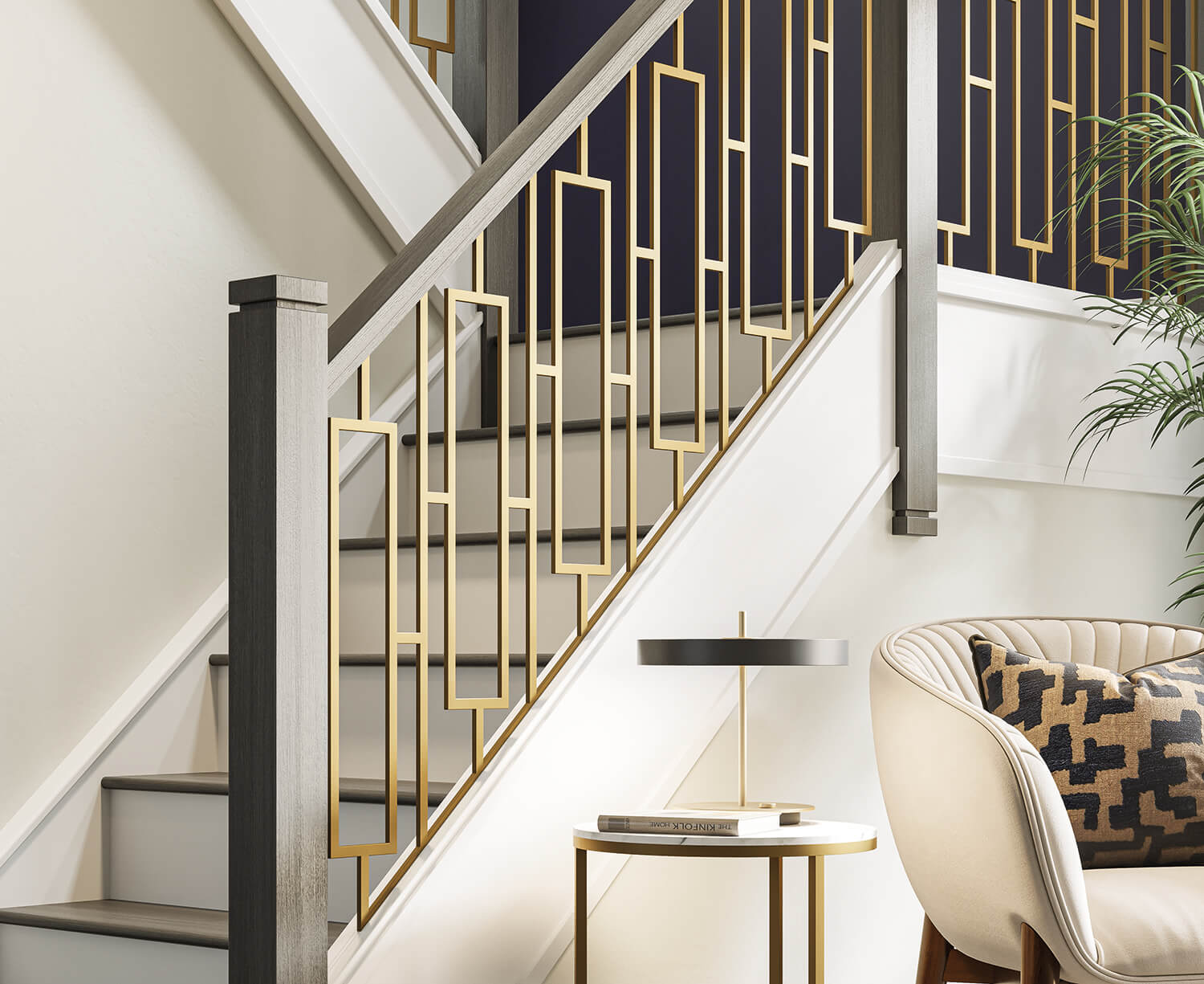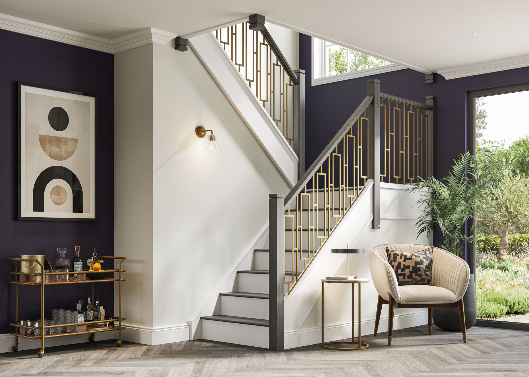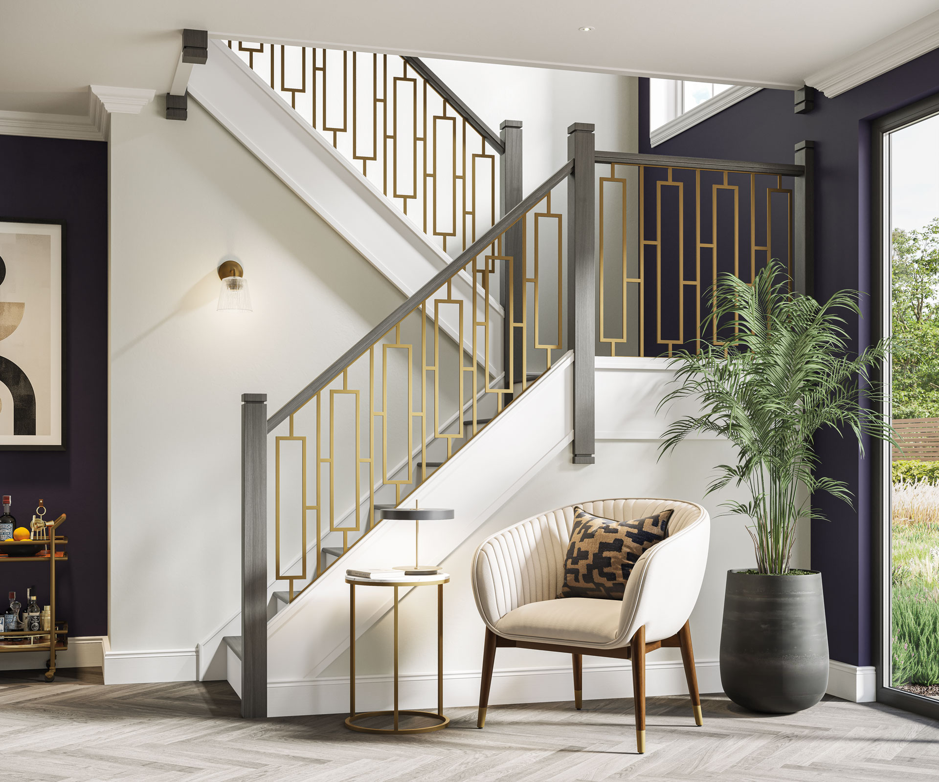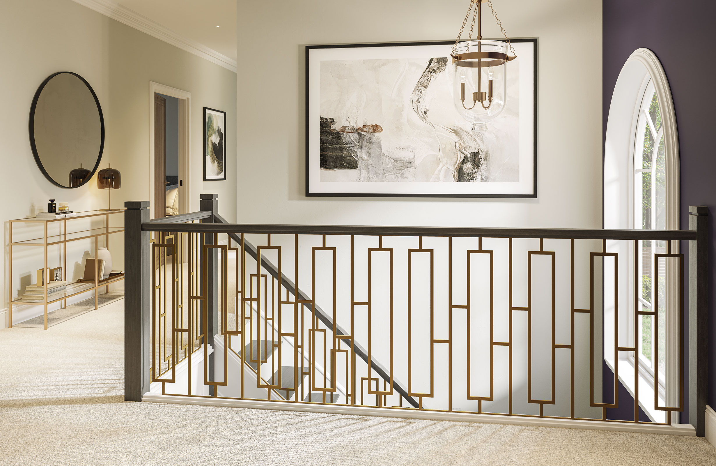 This gorgeous steel design combines classic luxury with contemporary flair. Finished in a stunning brushed gold, this balustrade adds rich sophistication to the staircase and hallway.