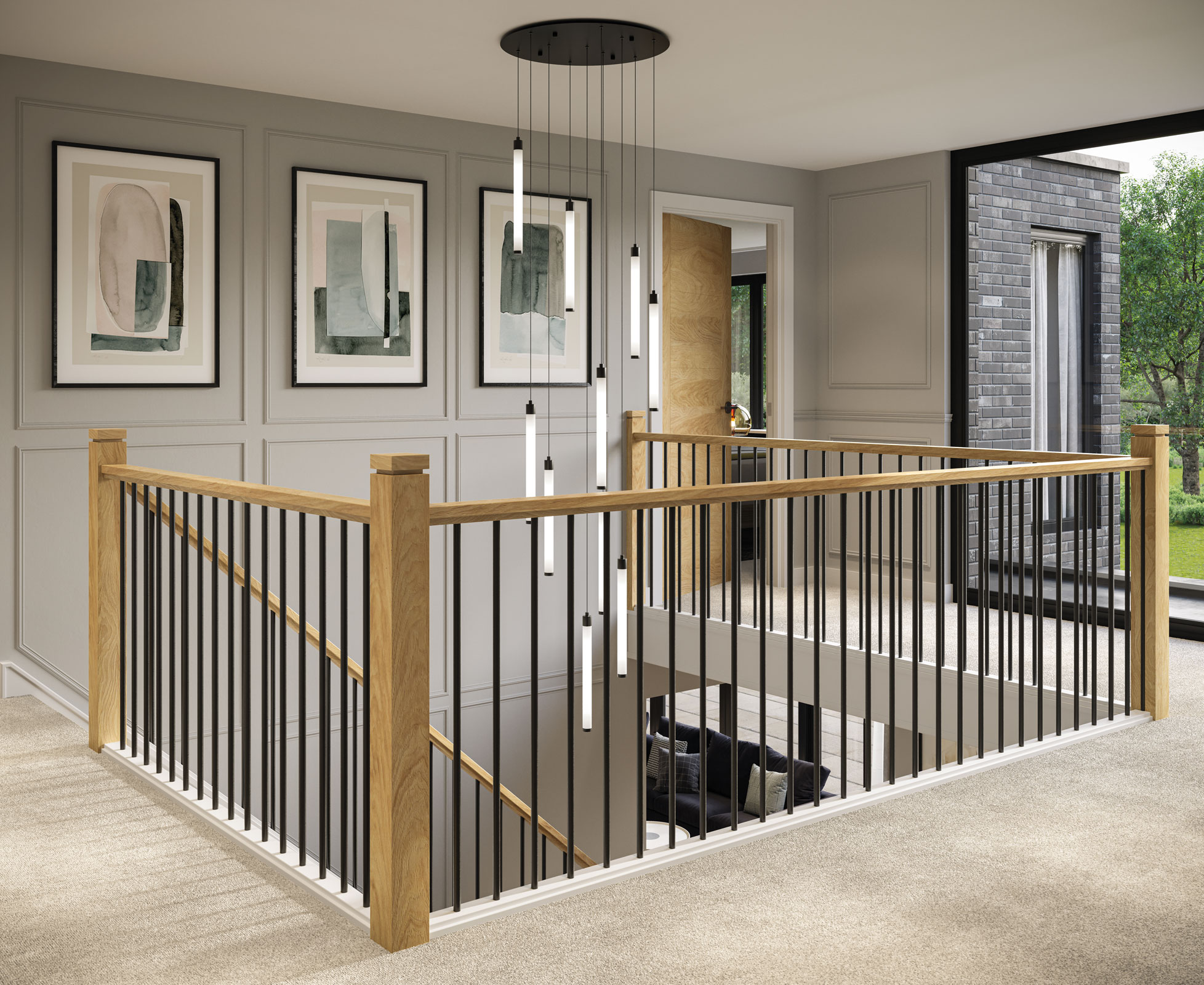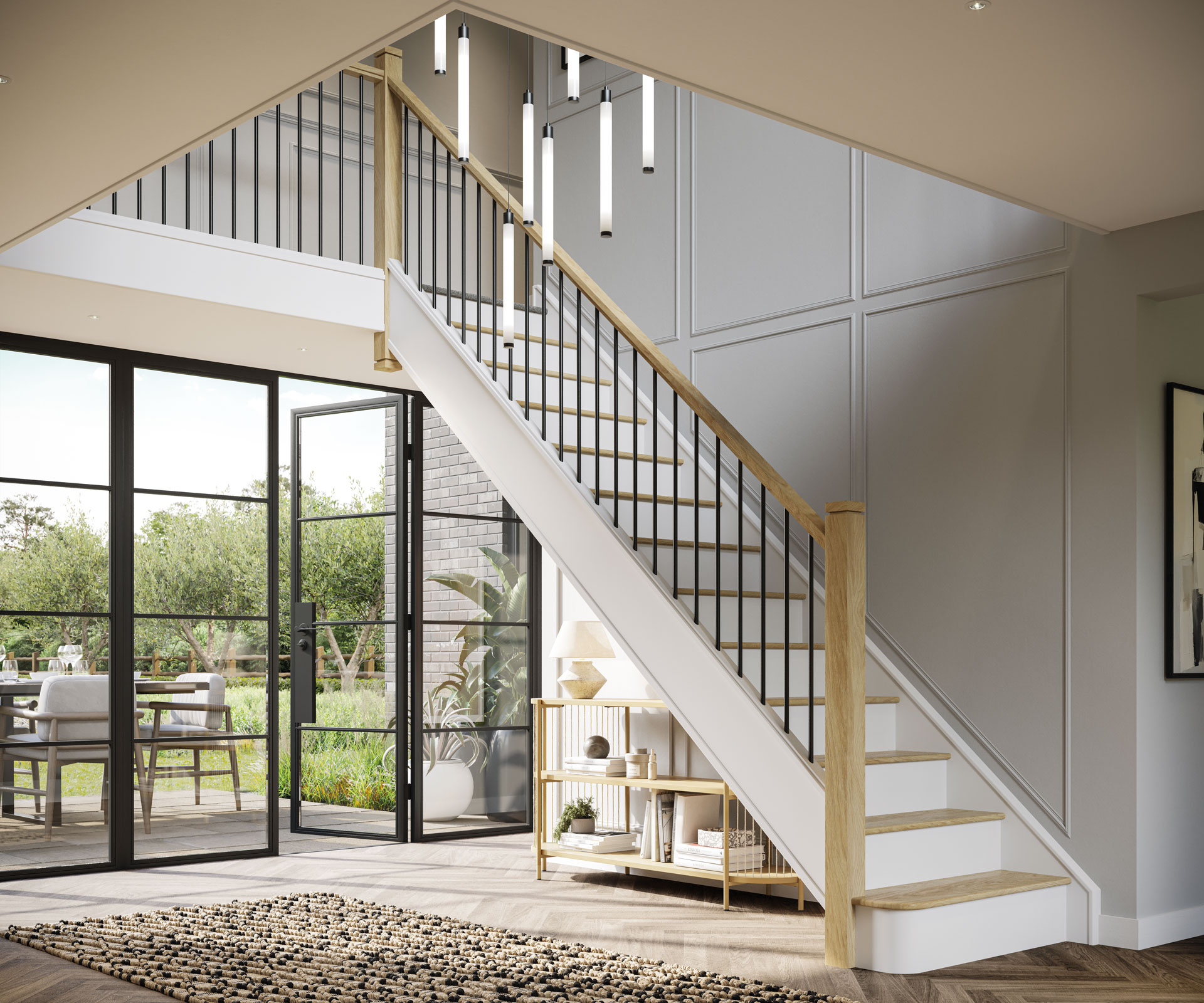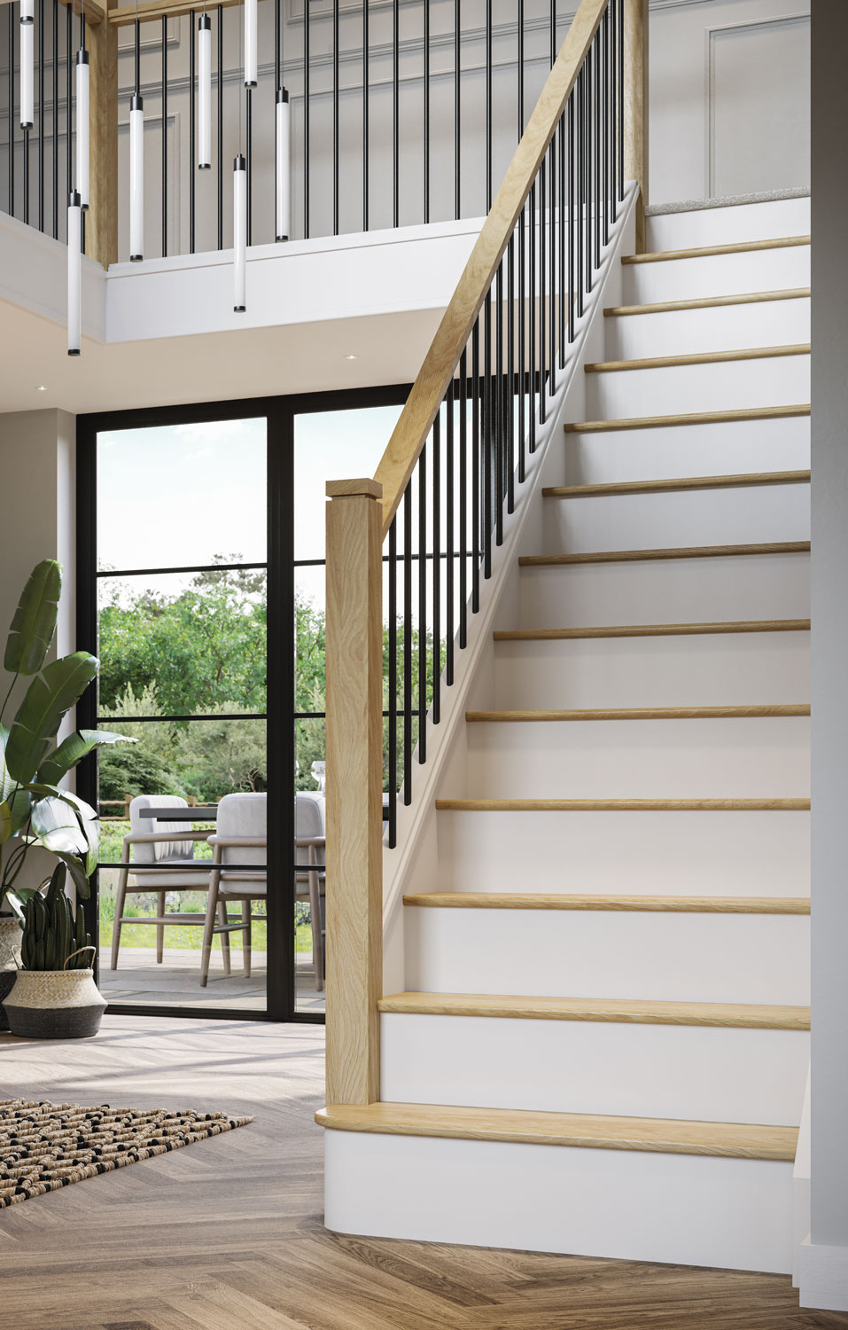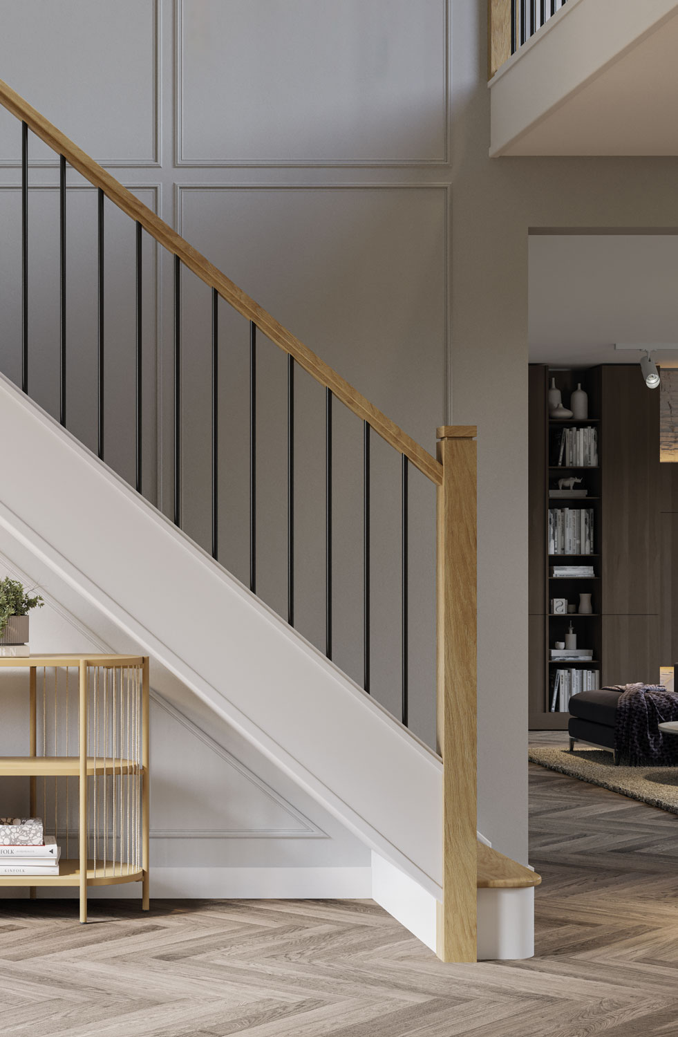Our Luxury Oak Staircase showcases Linea newels and handrails in Natural Oak adorned with our stunning Vienna spindles. The bullnose feature step combines a Natural Oak treads and risers painted in Orchid. Step by step, elevate your home with timeless charm and contemporary allure.