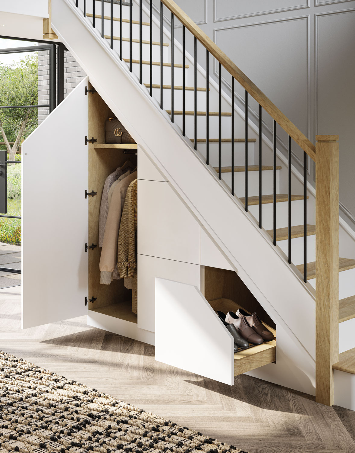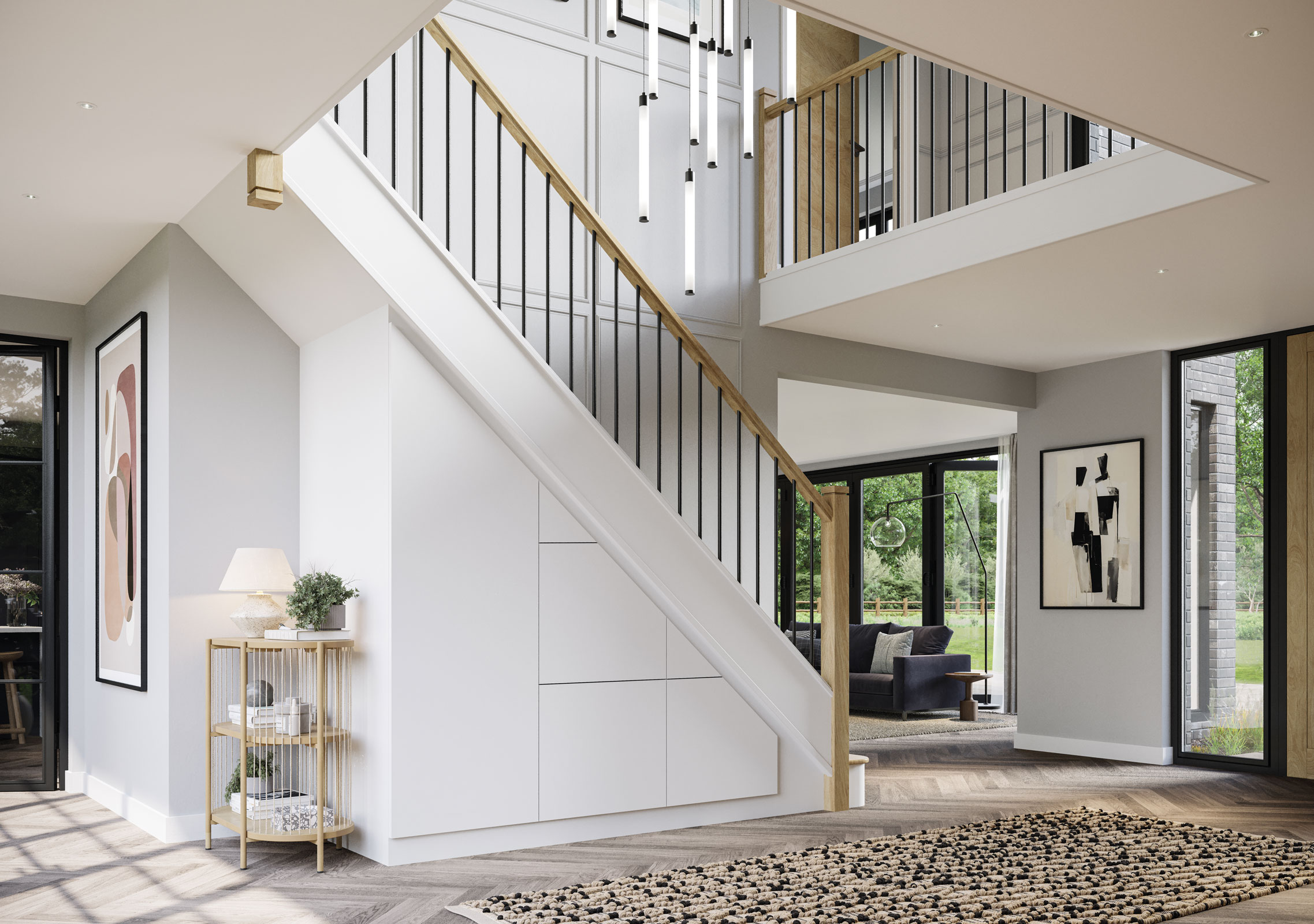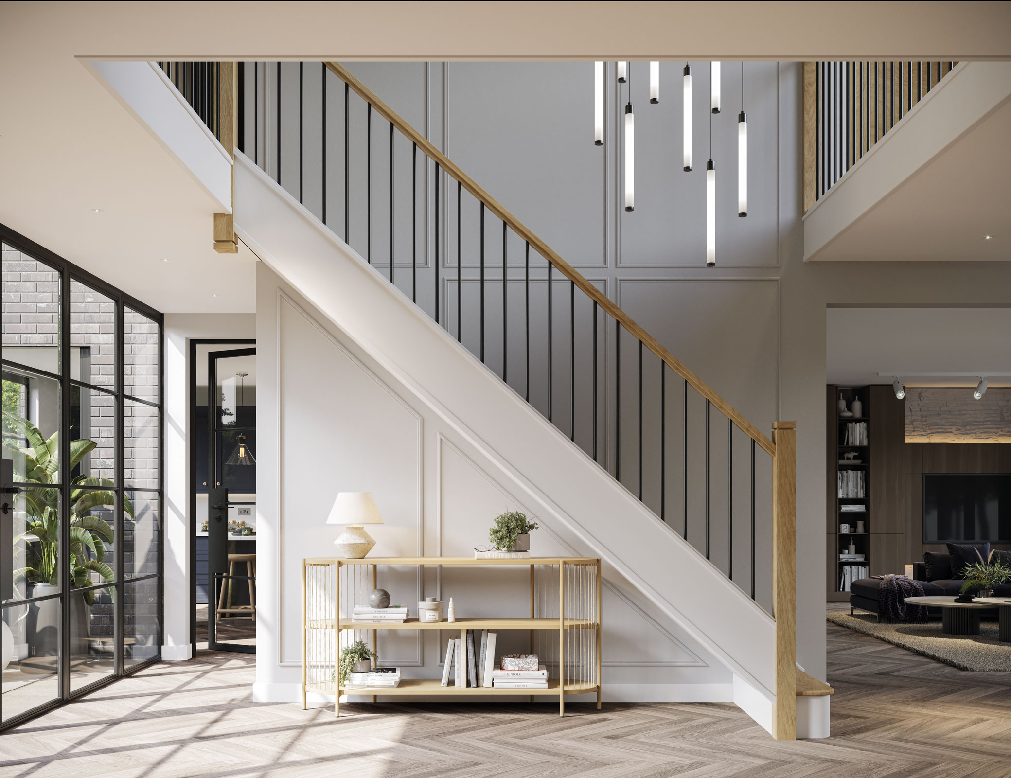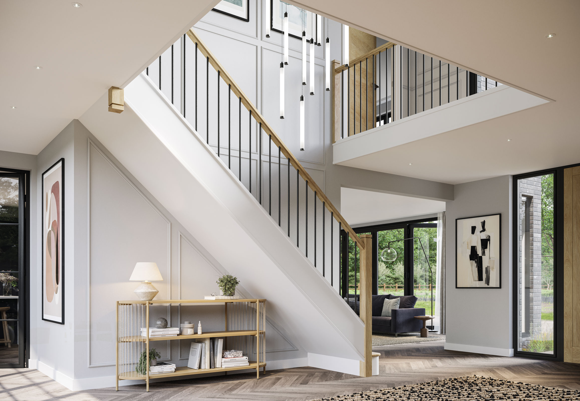 Our Luxury Oak Staircase showcases Linea newels and handrails in Natural Oak adorned with our stunning Vienna spindles. The bullnose feature step combines a Natural Oak treads and risers painted in Orchid. Step by step, elevate your home with timeless charm and contemporary allure.