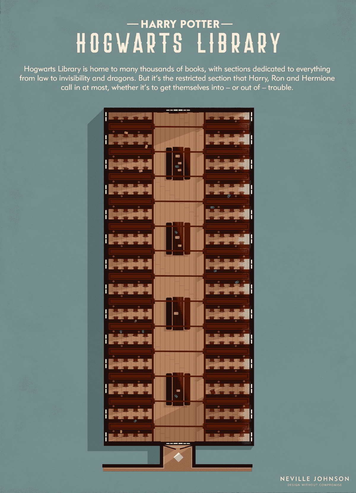 Located off a corridor on the first-floor of Hogwarts School, this library is at the centre of the action right throughout the Harry Potter film series. It's where Harry, Hermione and Ron turn to for information on how to get themselves out of - or into - trouble; often sneaking into the restricted section by various means.