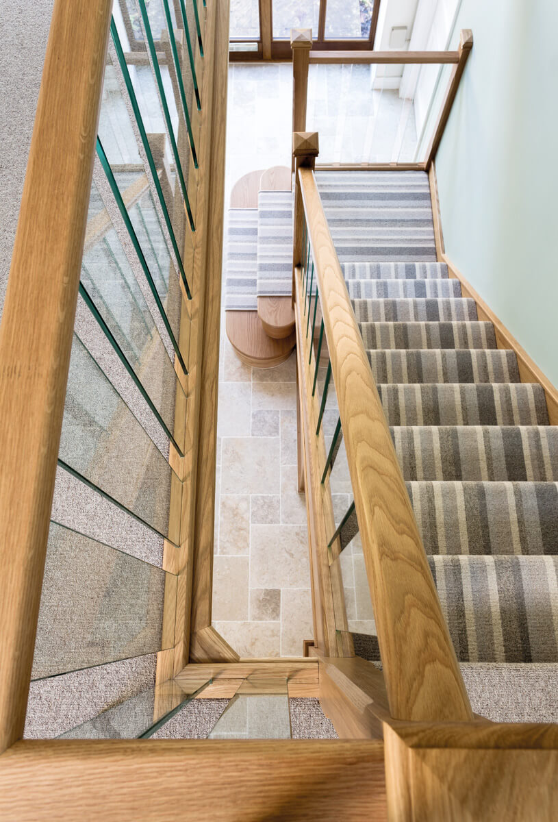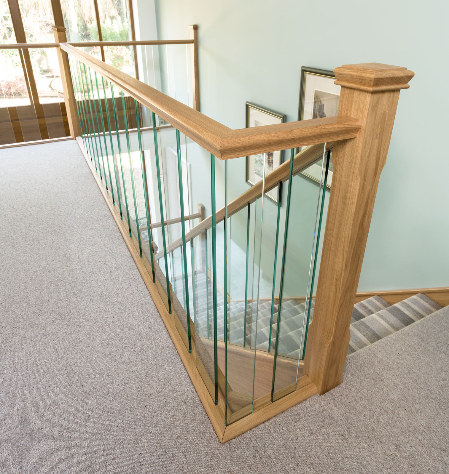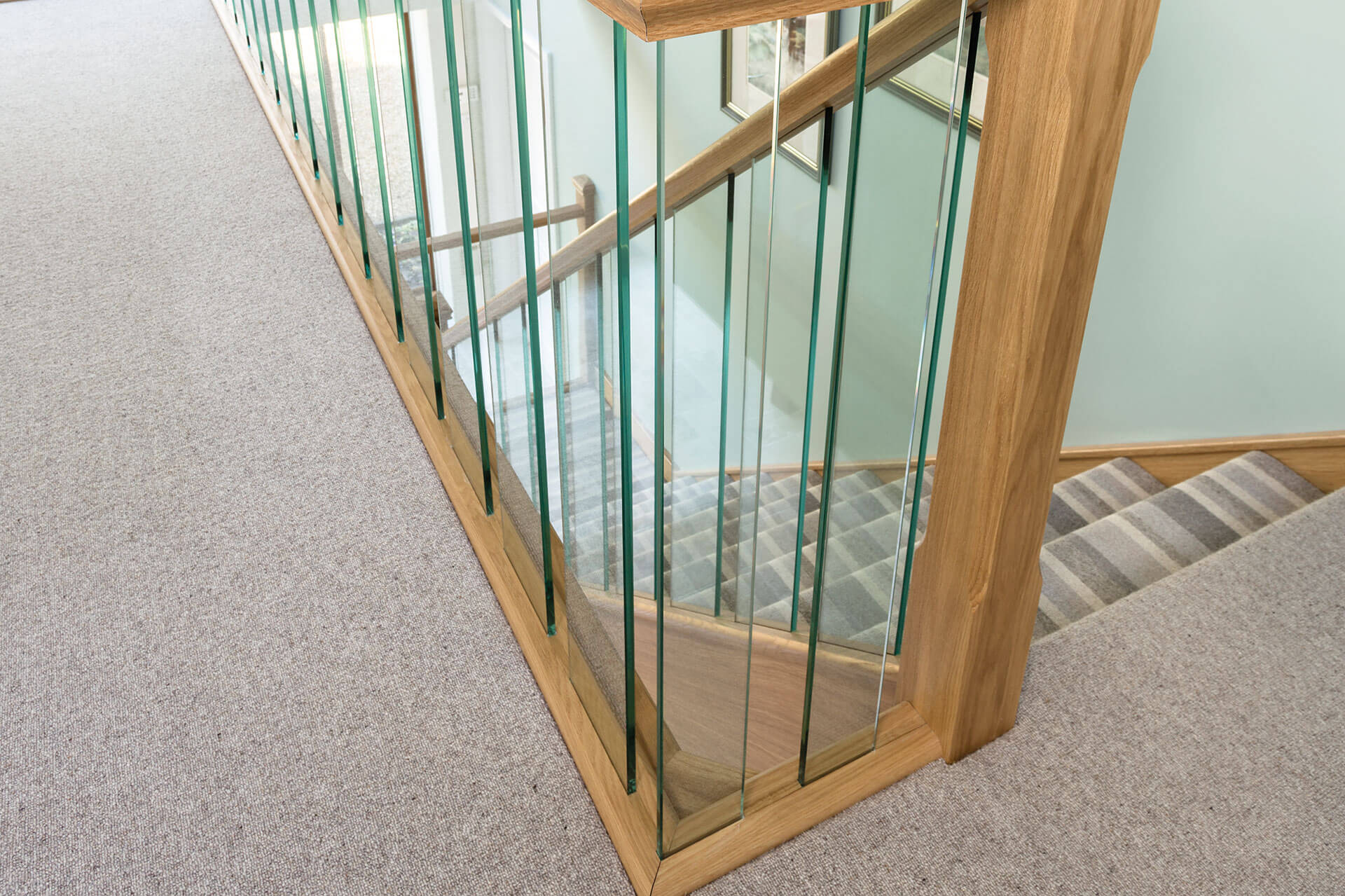 This modern staircase design features an oak and glass balustrade that transforms the staircase into a stunning focal point. The bespoke glass spindles are fixed directly into the base for strong, clean lines and a modern look. Choose this striking design if you want a unique, contemporary staircase that impresses guests and remains a talking point for years to come.