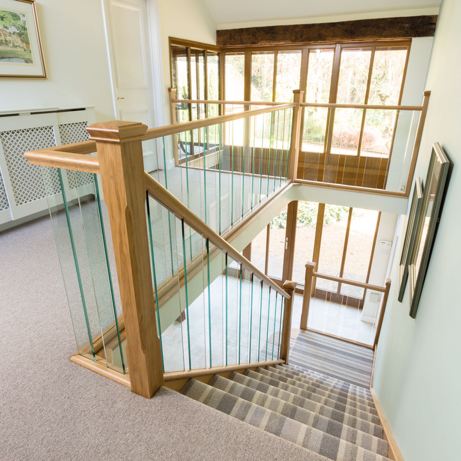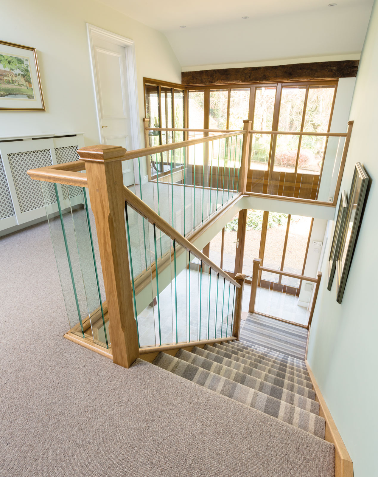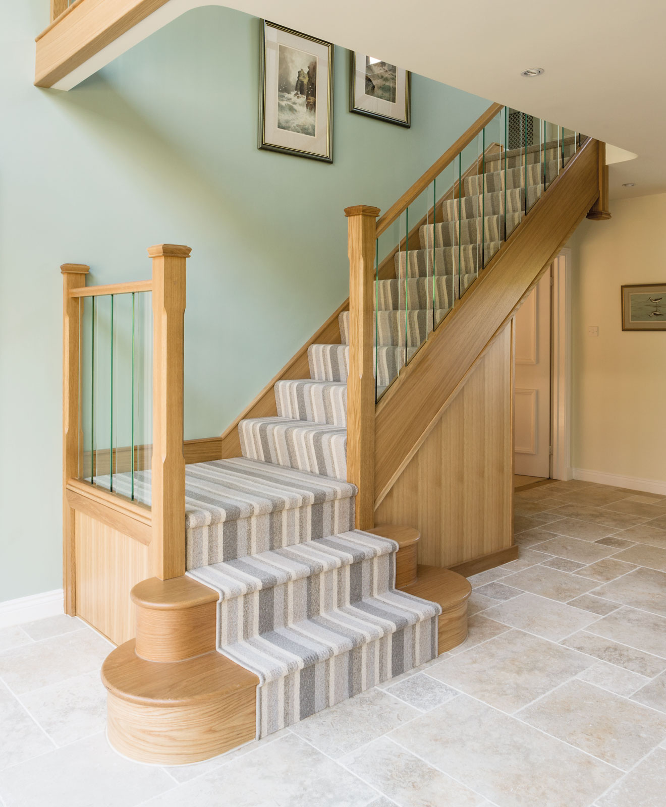 This modern staircase design features an oak and glass balustrade that transforms the staircase into a stunning focal point. The bespoke glass spindles are fixed directly into the base for strong, clean lines and a modern look. Choose this striking design if you want a unique, contemporary staircase that impresses guests and remains a talking point for years to come.