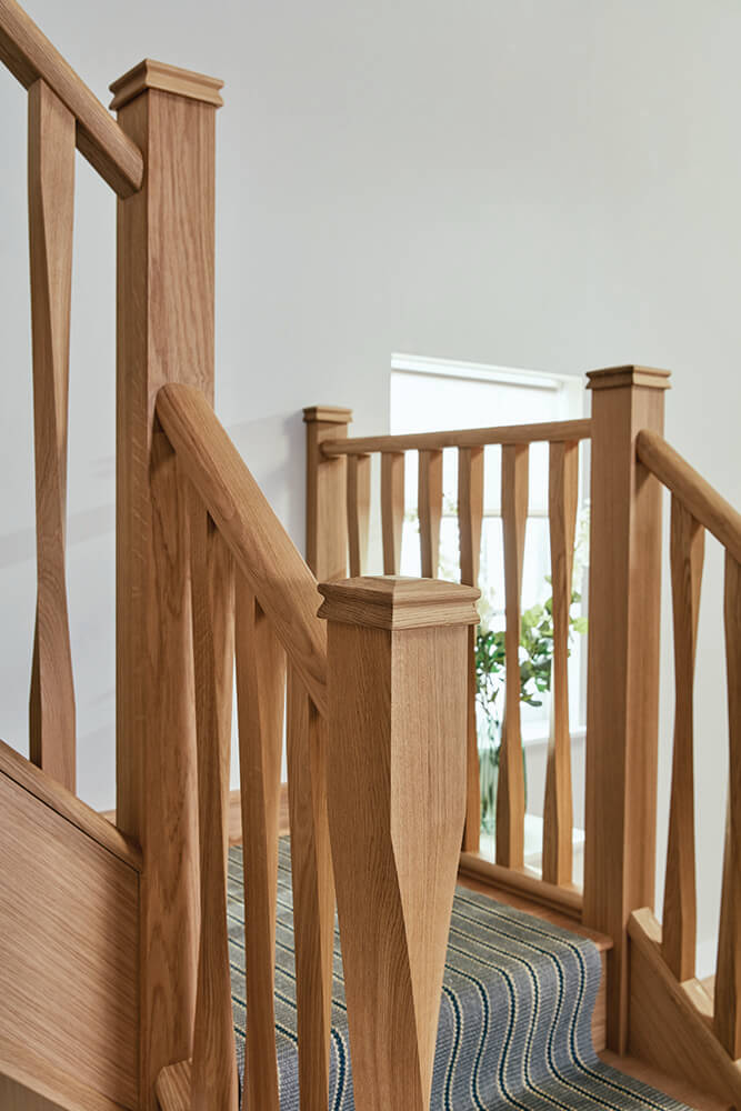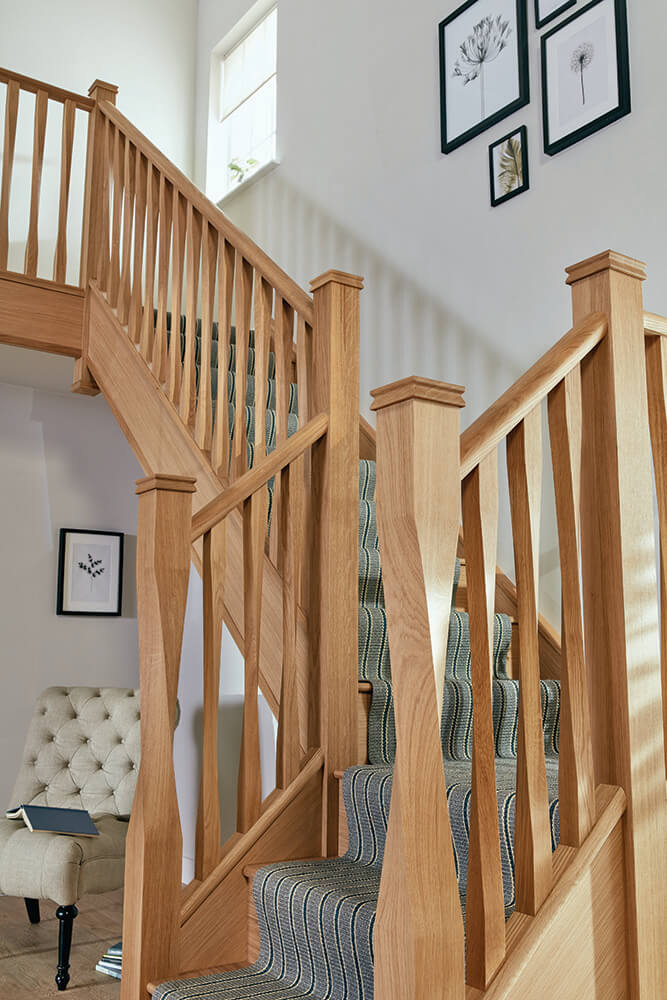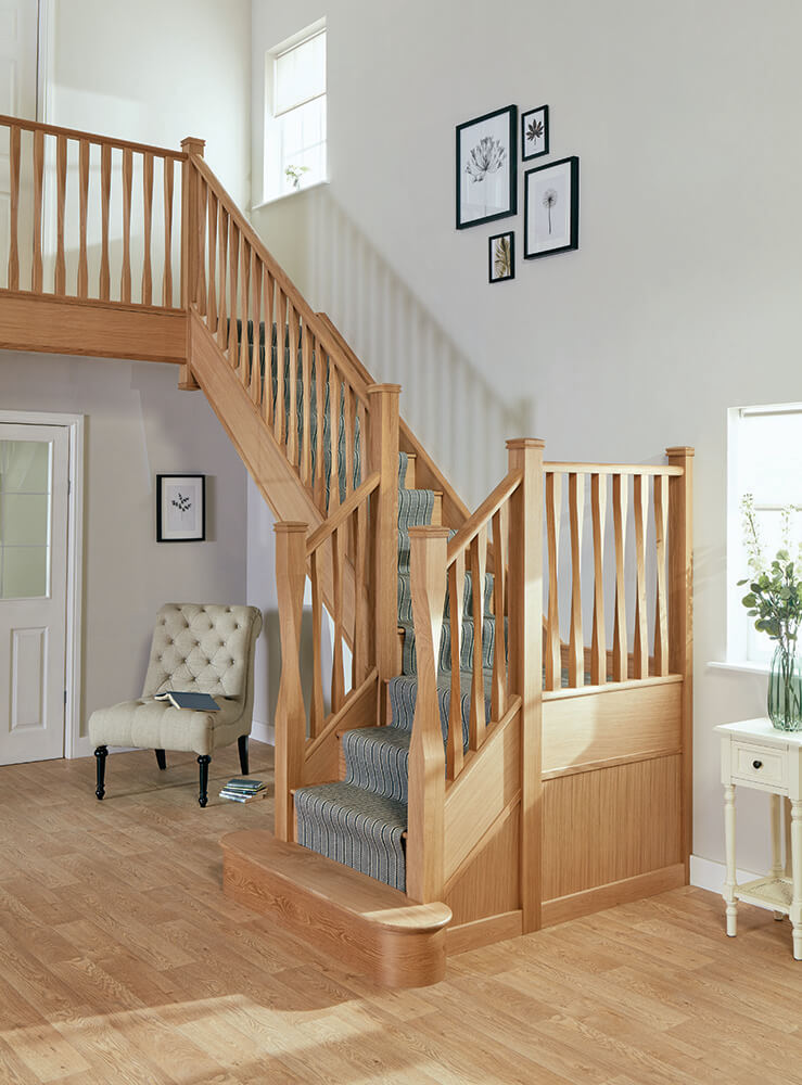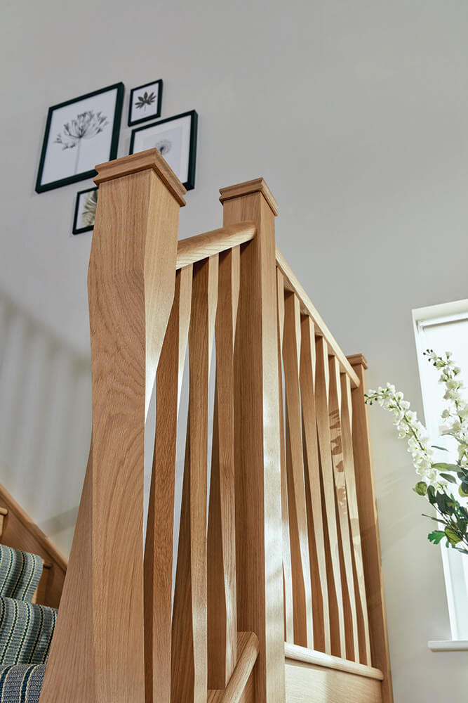 Introducing a twist on the classic oak staircase, the Eden Oak Staircase will give every hallway a touch of class. The spindles and newel posts have a sculpted design that adds a depth of character to this stunning staircase. Eden is handcrafted and carefully fitted to enhance and reinvigorate a wide choice of spaces from grand entrances to homely hallways.