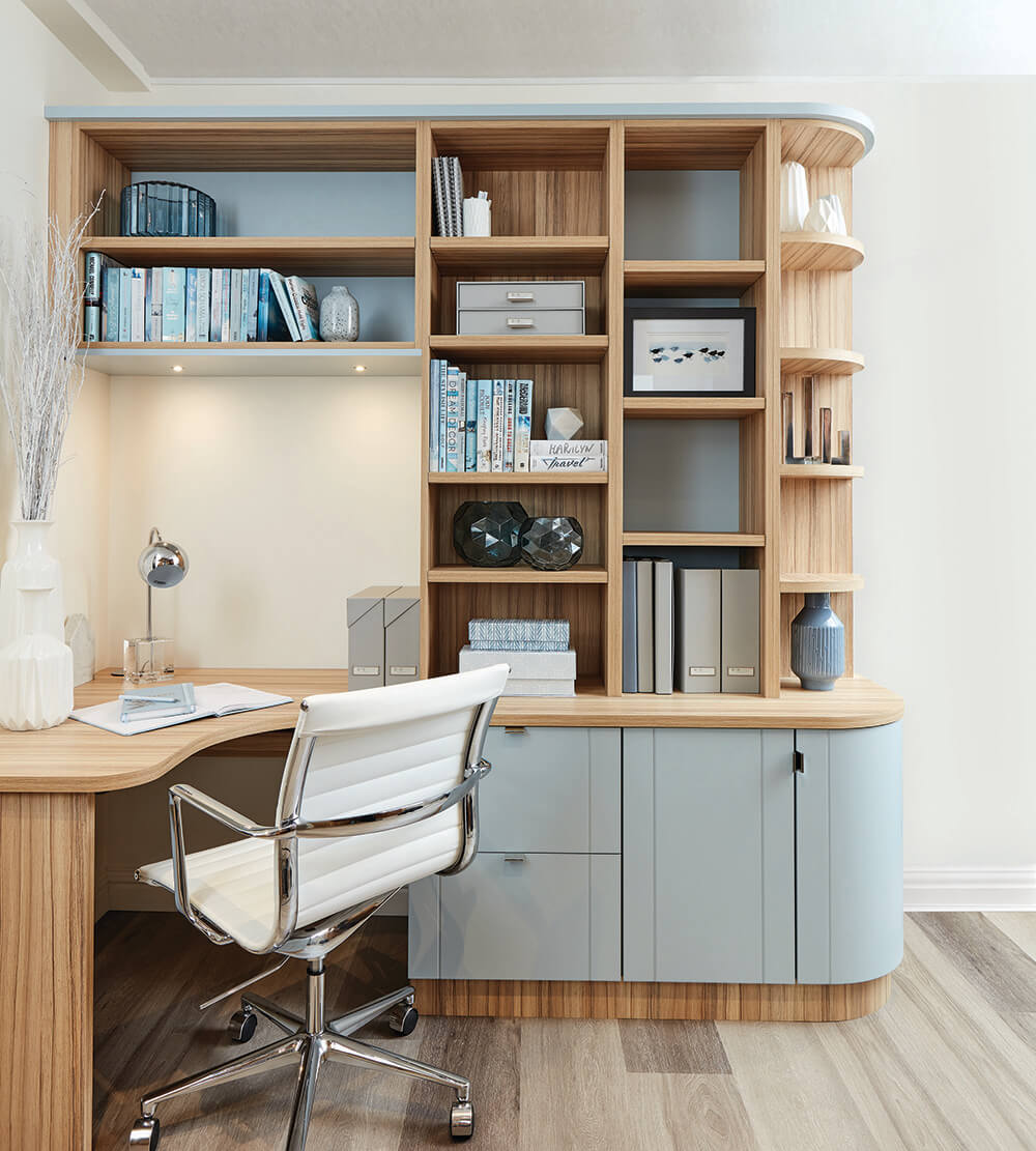 Carefully considered splashes of colour can bring a design to life. Accent colours can be muted, bright and energetic. You might be working from home, but that doesn’t mean you can’t add personality to a space. Shelving also allows you to display pieces of art, professional awards or family photos. If you have a hobby or interest, weave aspects of what you love into your office design.