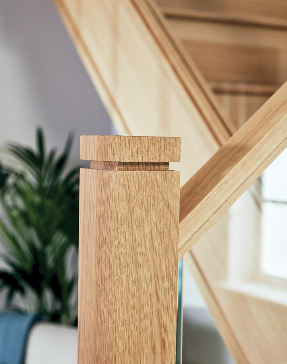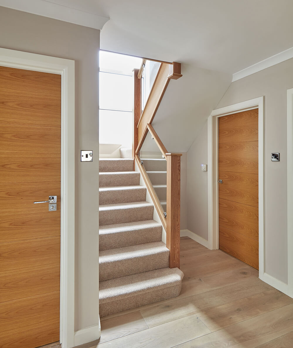 Glass can give the impression of your staircase gracefully floating. It’s a beautiful choice for both vast and compact spaces as it allows the light to flow through the entire hallway. This remarkable transformation combines a contemporary clear glass balustrade with a warm solid oak handrail for a timeless look that complements the homes elegant style.