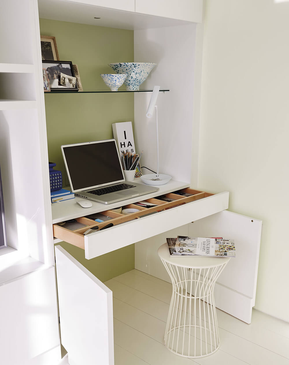 Office desks and chairs can overtake your floor space so why not conceal them behind cabinetry. Perfectly placed amongst wall to wall storage is a built-in desk with stationery drawer, suspension filing and pull-out printer shelf, creating a compact study perfect for answering emails or completing homework.