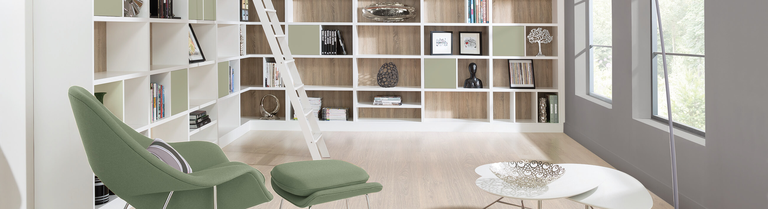 This modern white painted library features sage green and charcoal grey accents while incorporating the soft, warm tones of Bardolino oak. Floor to ceiling storage adds a sense of drama, and when combined with the right furnishings and accessories the finished result is a stylish, uncluttered space ideal for relaxing.