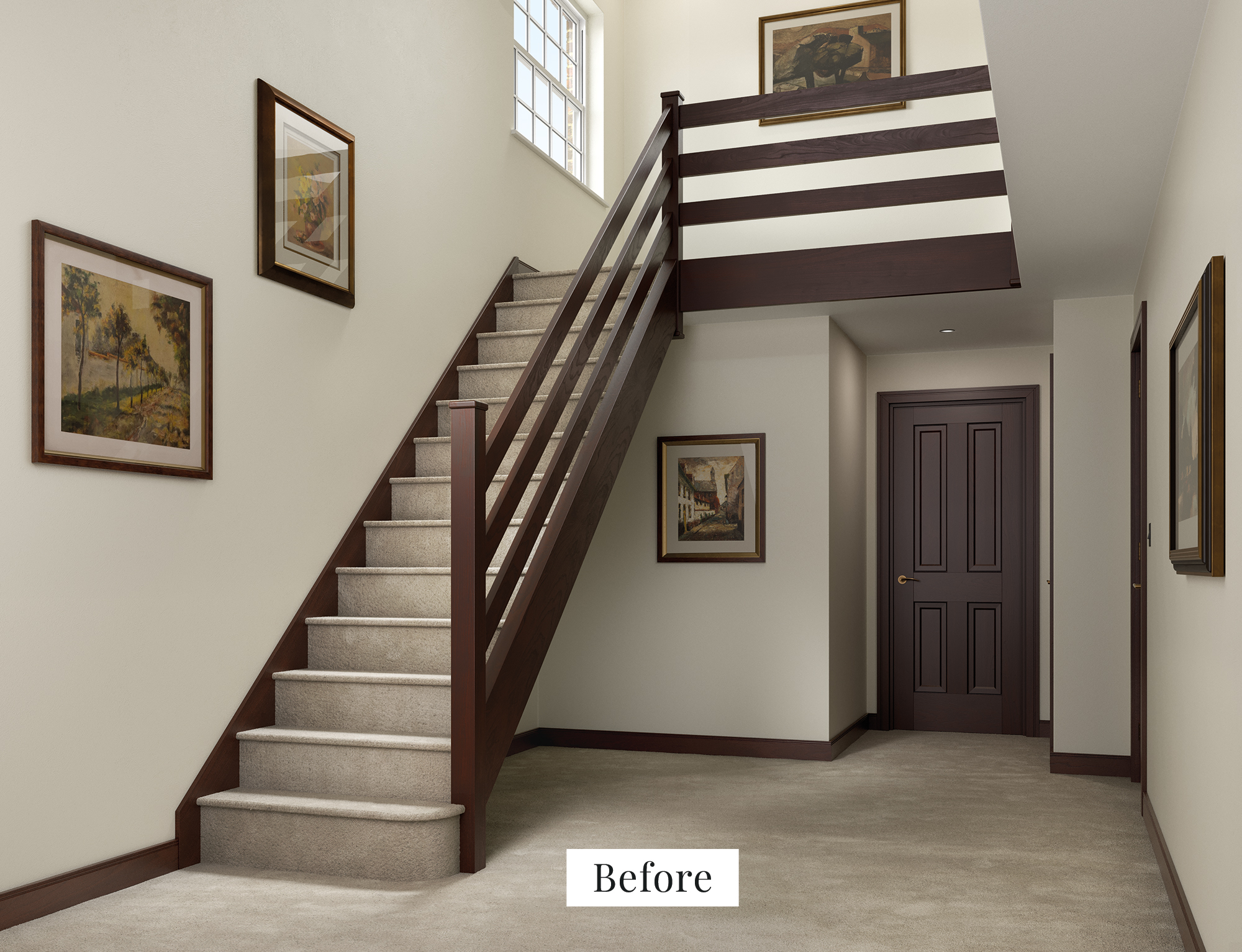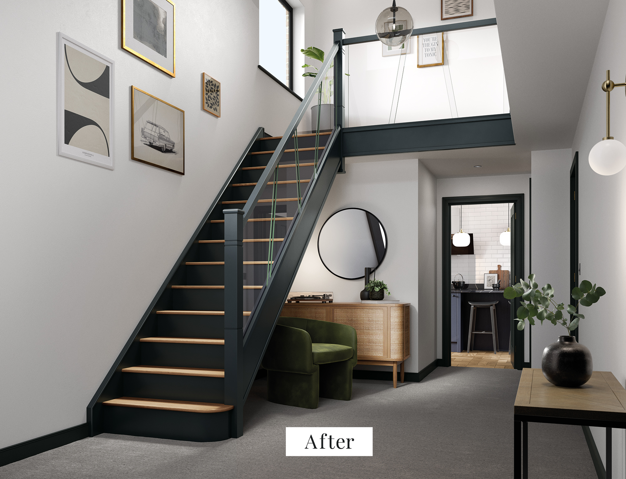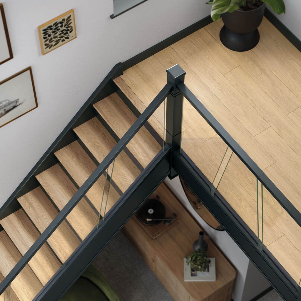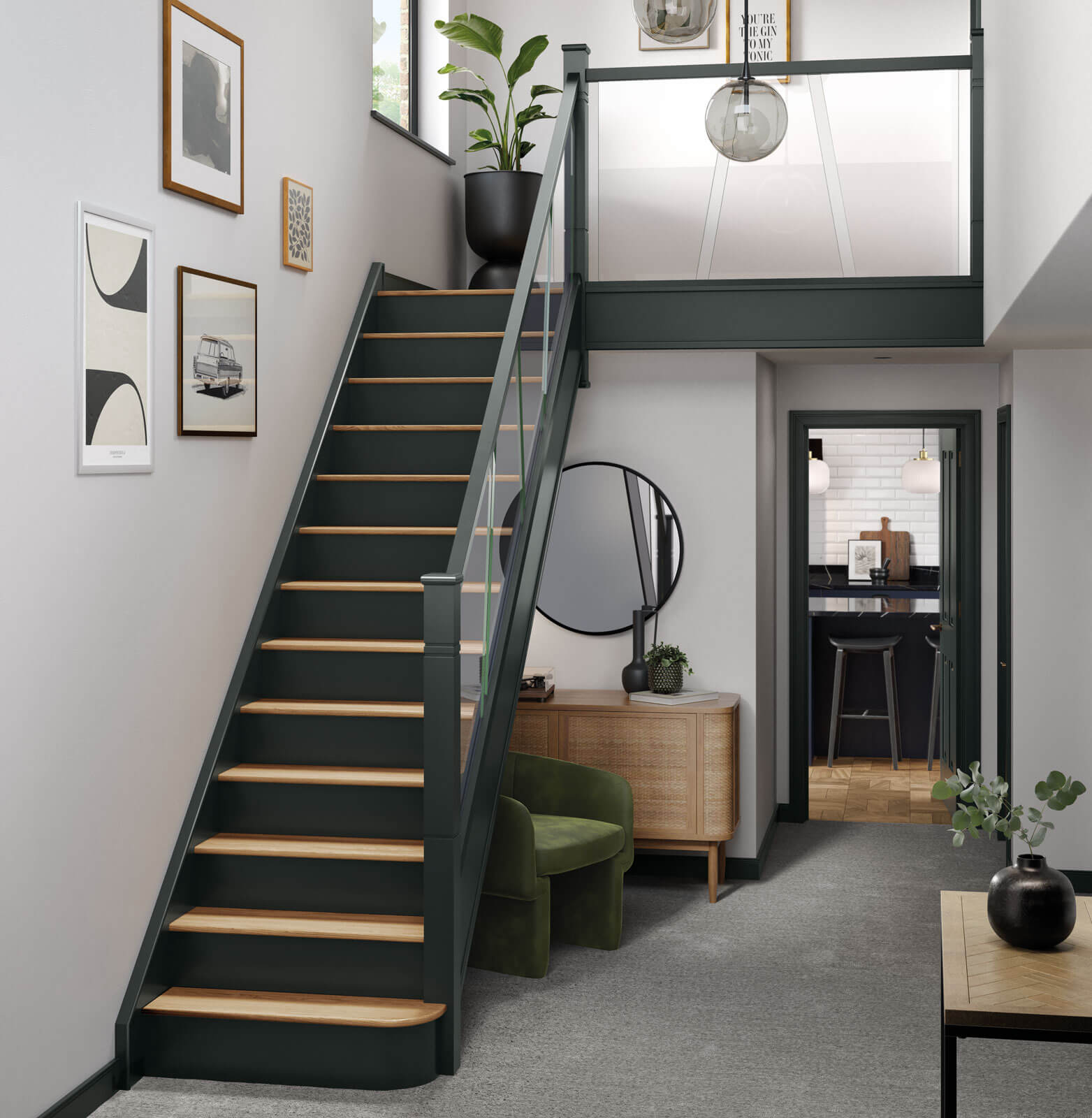 A fine example of how a hallway can define your home, this beautiful painted glass staircase is a sure way to transform your hallway. Using Natural Oak treads in contrast against dark painted risers and timber components, our expert designer has created a real statement piece. This staircase is painted in our exclusive colour Lithadora, a gorgeously moody blue, and paired with our Molto glass balustrade. The asymmetrical lines of the glass panels add a contemporary flair to a traditional glass solution – the perfect staircase for a stylish interior.