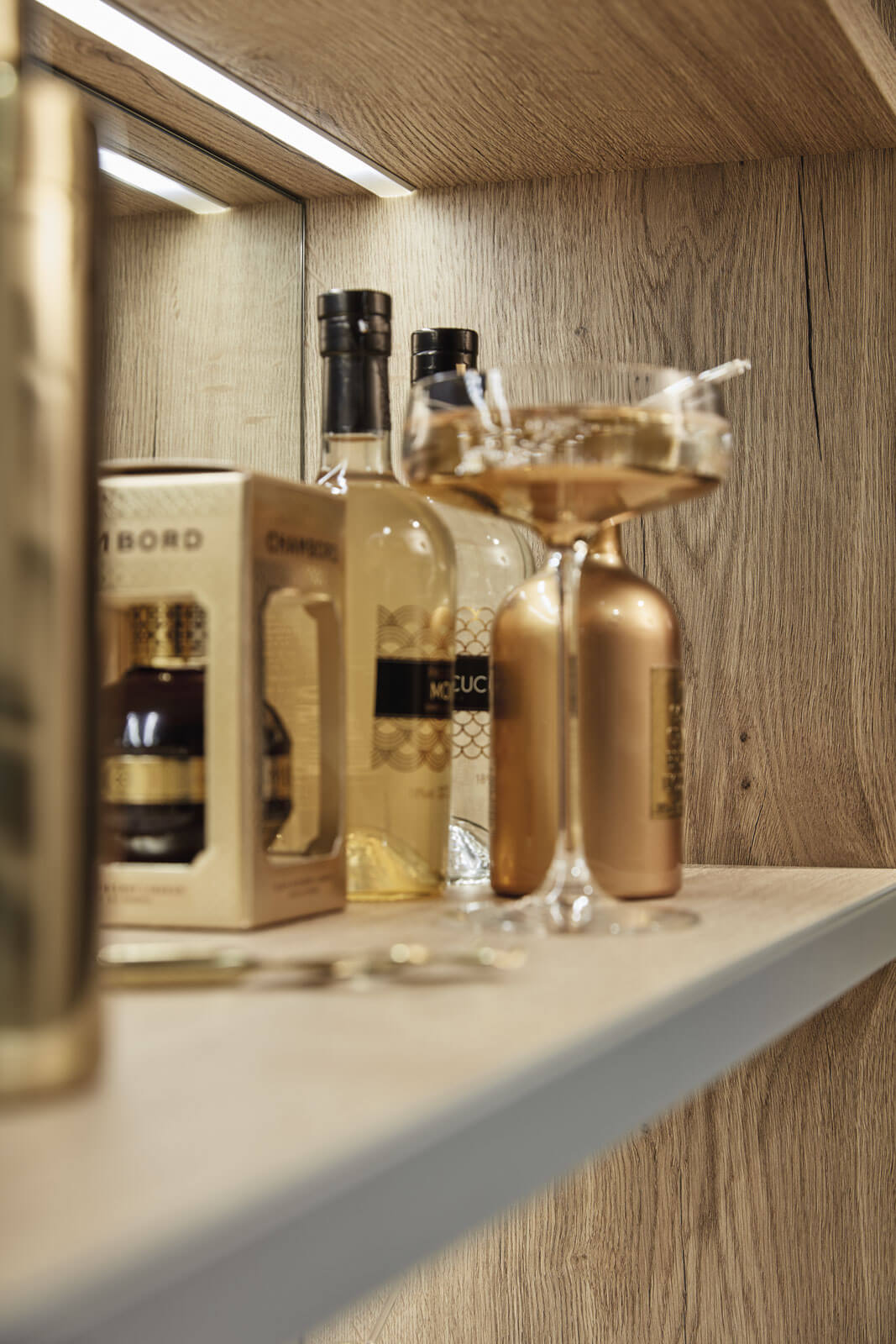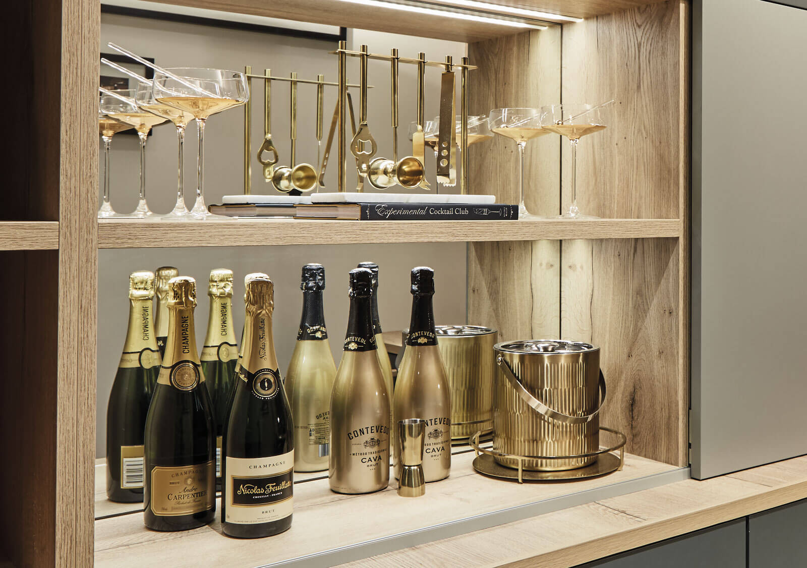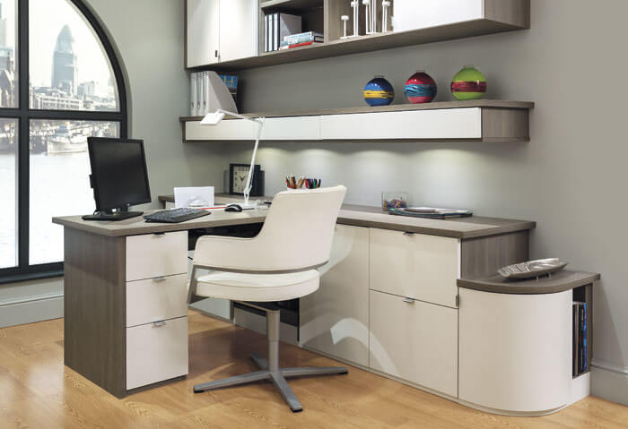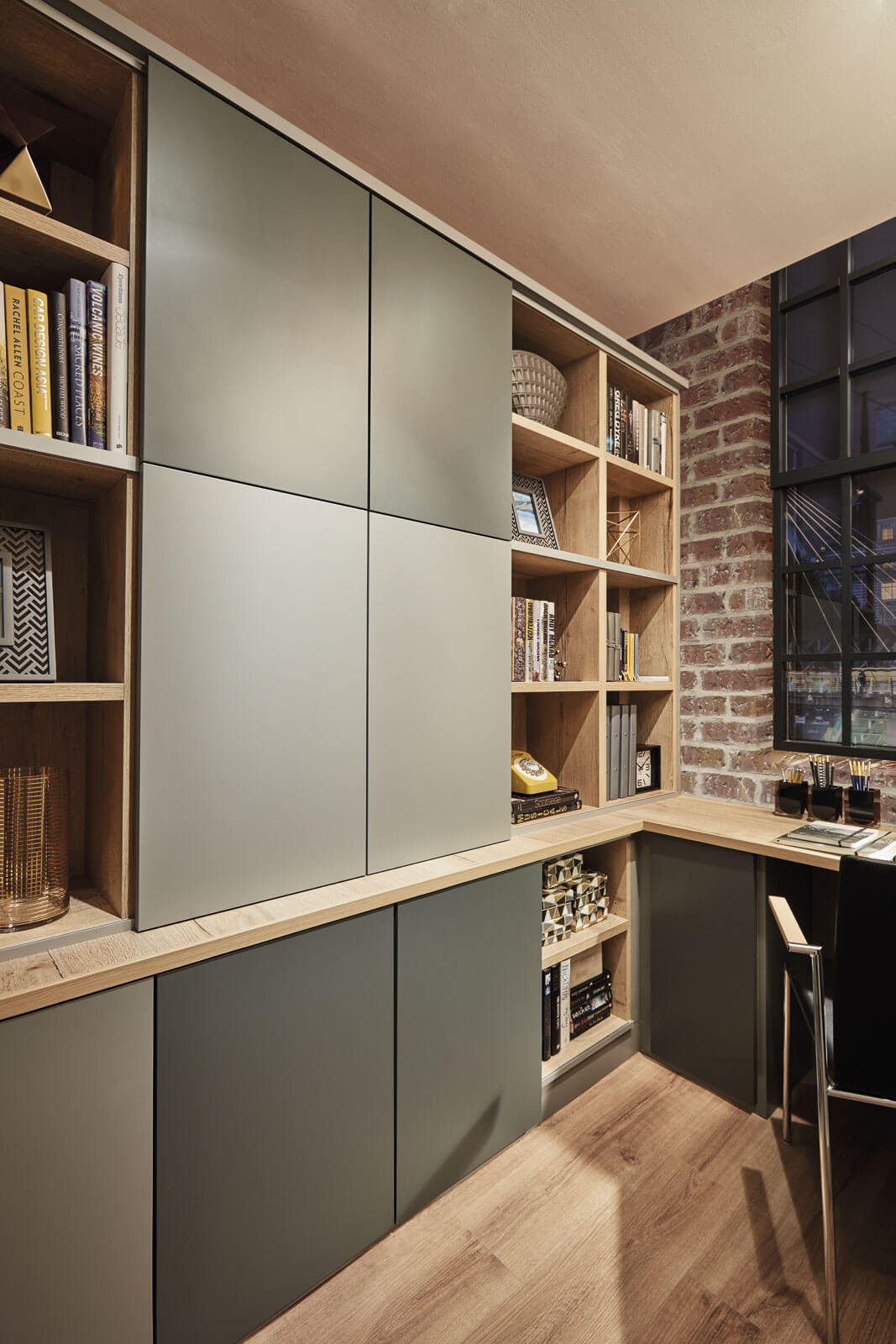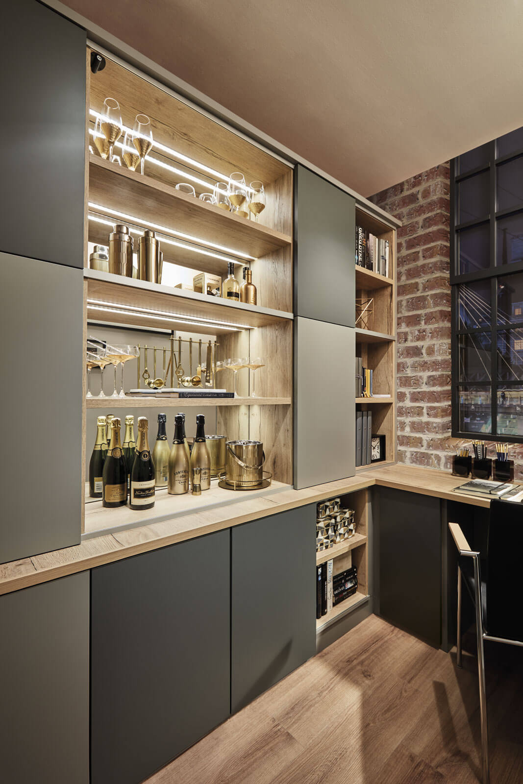 This rustic oak and grey panelled study furniture is perfect for a room that combines work and play. The integrated desk area connects to custom-built storage. There are open and covered areas for displaying books and storing important files. Concealed within the shelving is a dedicated home bar, complete with mirrored back panels. The overhead strip lighting is ideal for unwinding after a day at work. Not only is this study practical for work but it is stylish too.