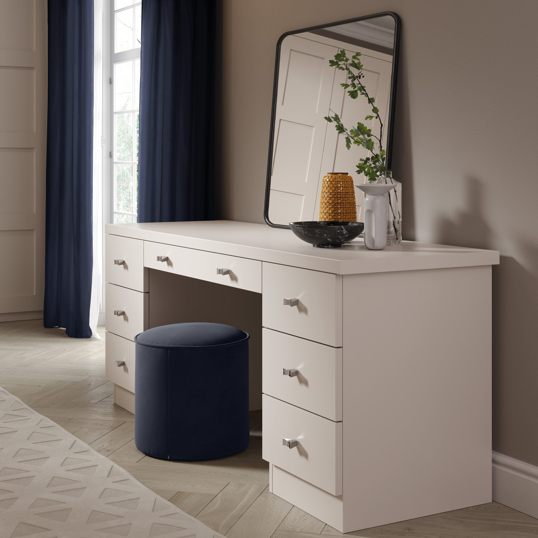 This contemporary interpretation of the timeless shaker style is perfect for those who prefer a bedroom that’s suited to a modern lifestyle. The rich and luxurious painted finish in our own colour, Comfrey adds a sense of quality that is difficult to imitate. Simplicity is key for this design, with the run of shaker style fitted wardrobes aligning perfectly to the wall, feeling like it’s part of the room itself. A complementary dressing table, perfect for getting ready in the morning, is designed with ample storage and style to match.
