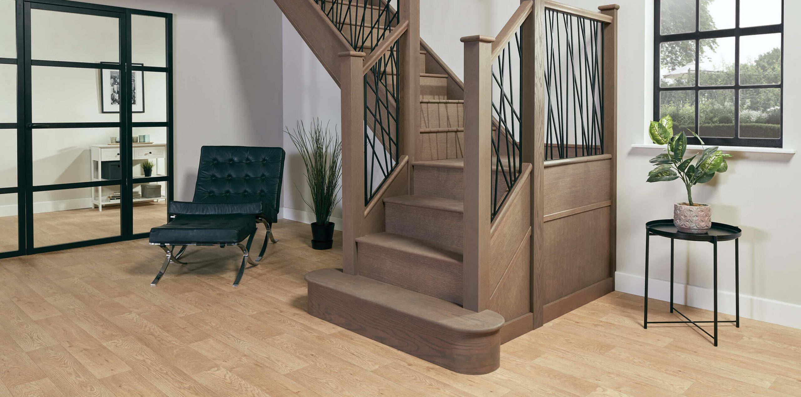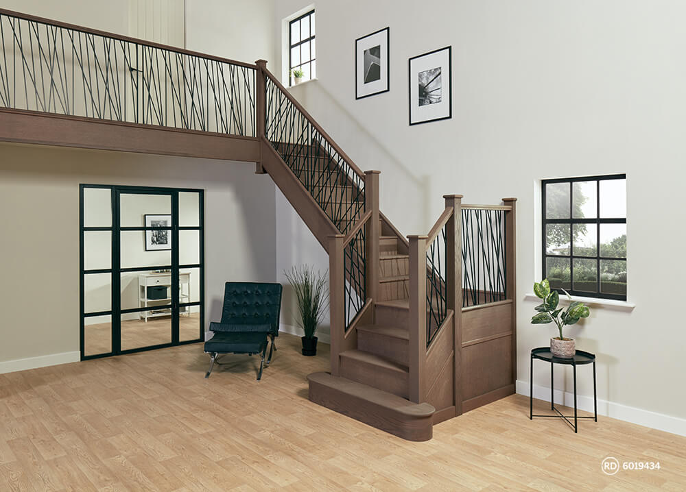 Our steel staircases are available in a number of design styles and finishes that are unique to Neville Johnson. In 2020 we introduced our stunning Stanza concept. Its fluid, organic spindles create a regular, repeating pattern that looks wonderful in both stylishly minimal spaces and traditional homes. Available in modern steel or antique brass to complement your décor, similar to our Opus design the style works beautifully with our selection of timber finishes.
