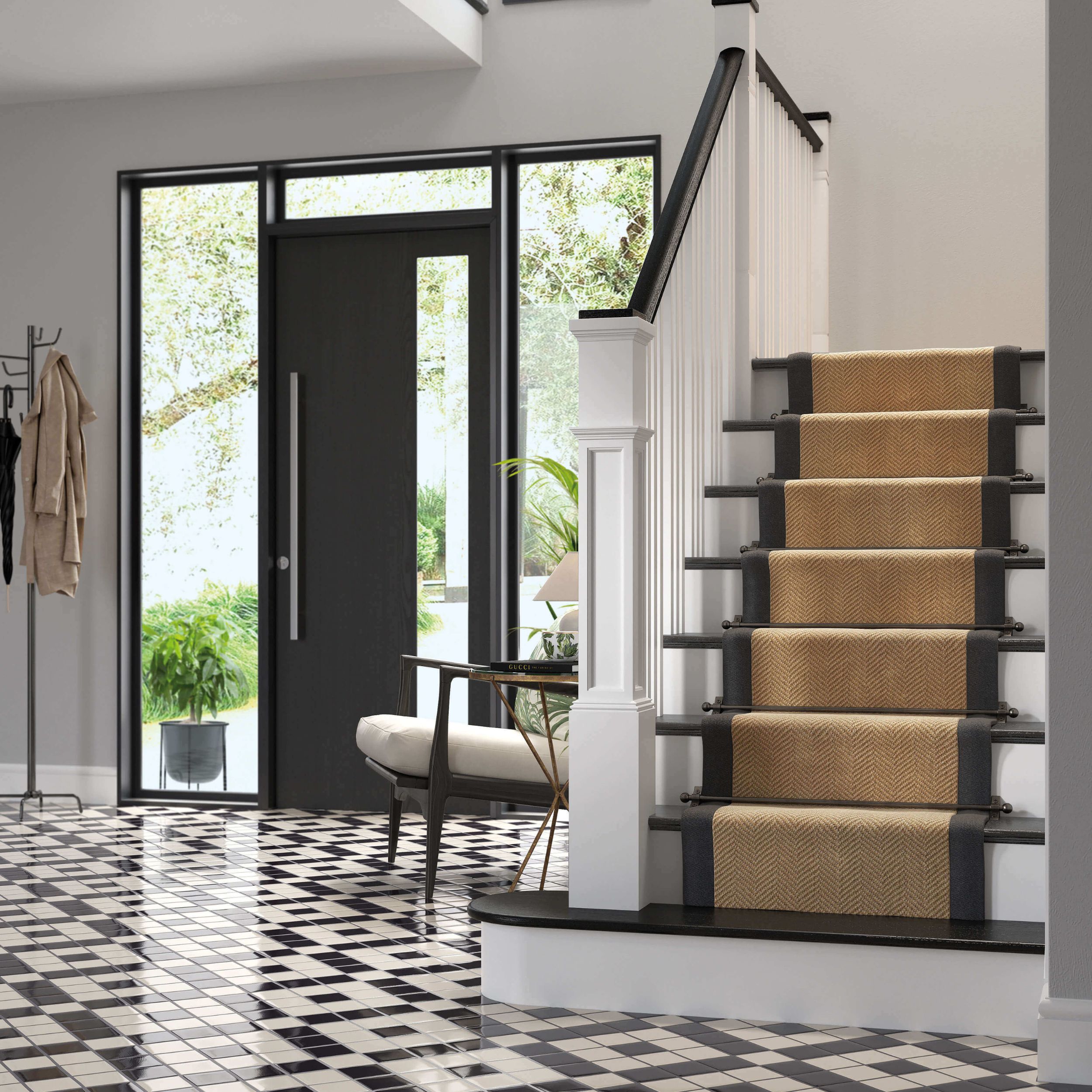 The stunning chequered tiled floor and the warmth of the jute stair runner provide the perfect foil to the staircase design.