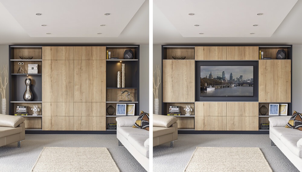 Peninsula units are perfect for larger living areas. They can create subtle segregation and are ideal places to display artwork and photographs. If you want a home cinema solution, think about mounting the TV on the wall with the wires discreetly stored away behind built-in furniture.