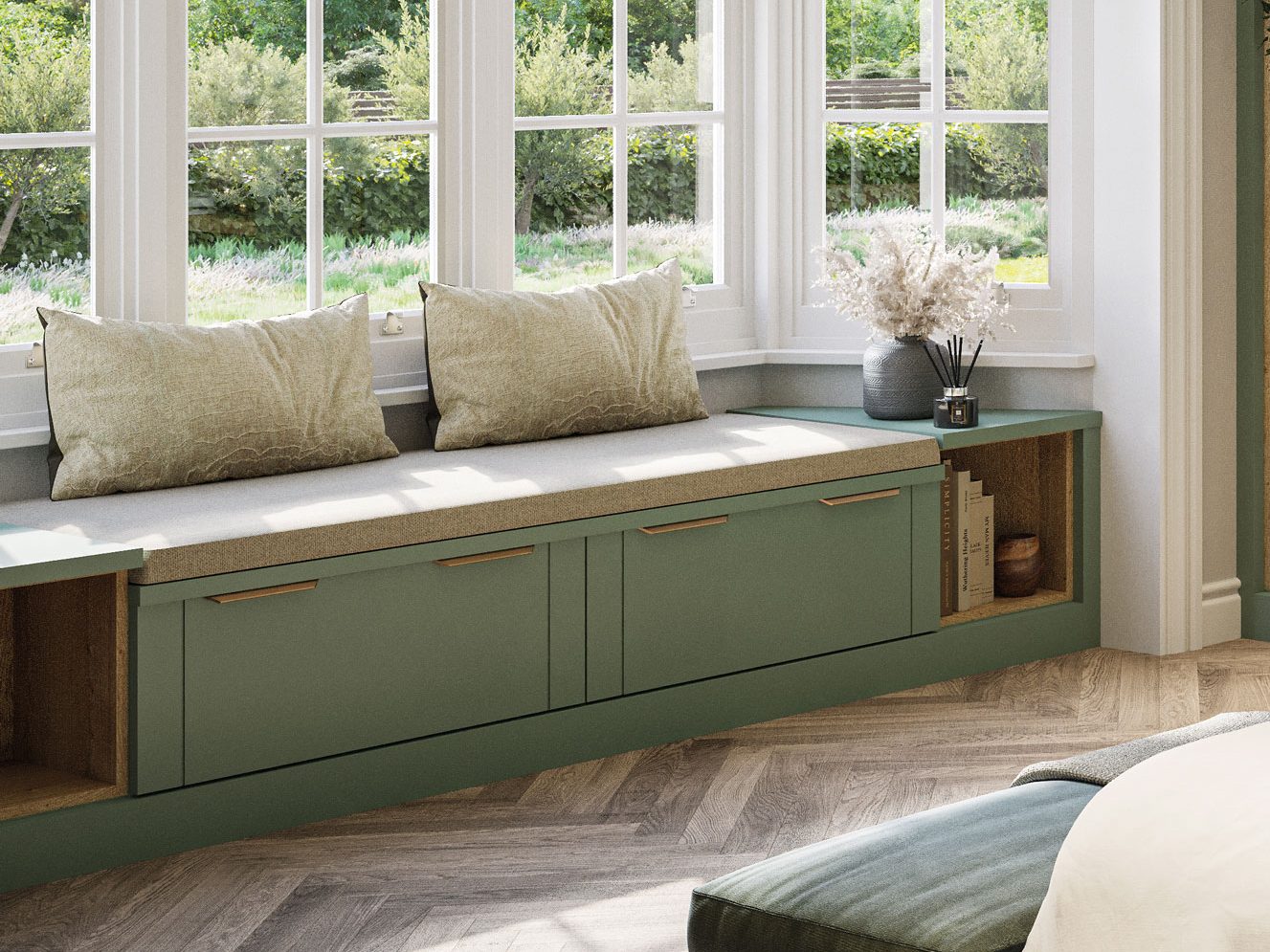 If space allows, built-in window seats are a charming and multifunctional addition to fitted bedrooms. They make the most of an underutilised space, providing a cosy nook with several practical uses: