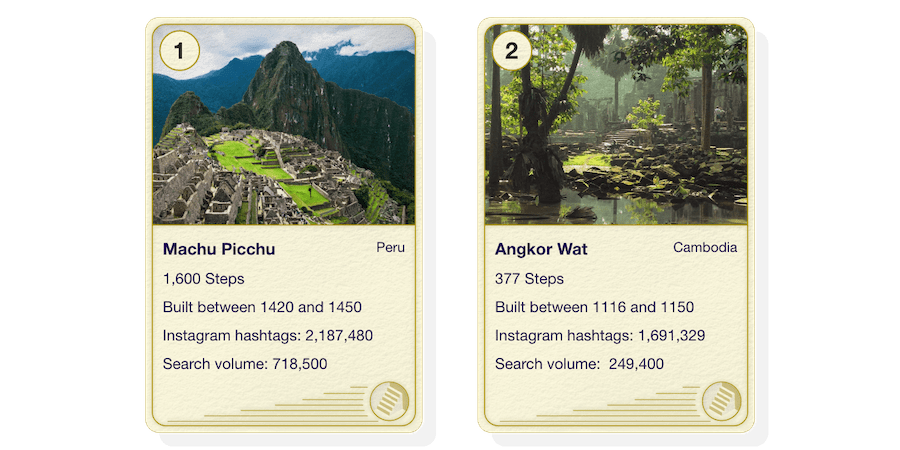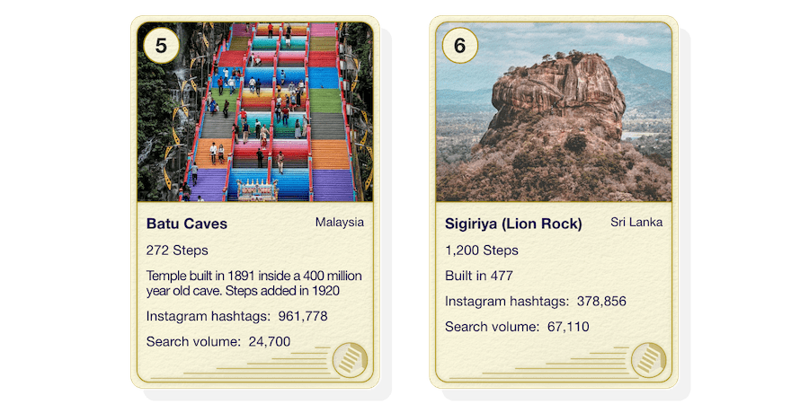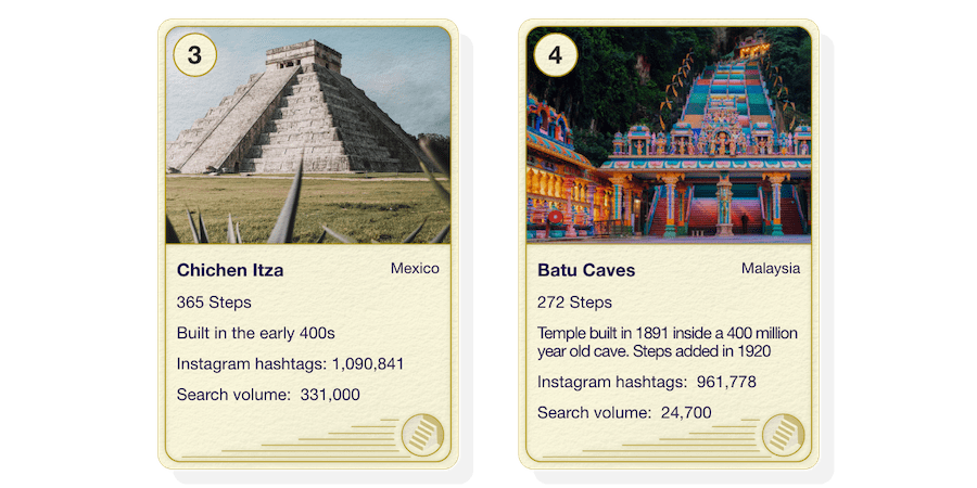 In third and fourth spots are the Chichen Itza in Mexico and the Batu Caves in Malaysia. Chichen Itza counts just over one million Instagram hashtags, with an annual search volume of 331,000 and more than two million tourist visits every year. The Batu Caves have 961,778 hashtags on Instagram and a search volume of 24,700, with 5,000 tourists visiting every day.