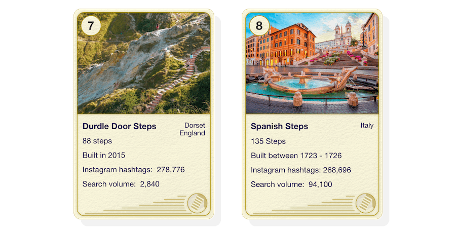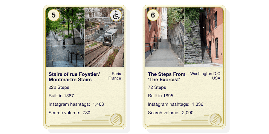 In fifth and sixth place come the Stairs of rue Foyatier in Paris, France and the iconic steps featured in The Exorcist in Washington D.C., USA. The former count 1,403 Instagram hashtags and a search volume of 780. In sixth, the haunting stairs featured in The Exorcist have 1,336 hashtags and a search volume of 2,000.
