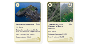 The stairs to Machu Picchu, the ancient Incan city, rank top overall. This historical staircase racks up more than two million hashtags on Instagram, with an annual Google search volume of 718,500 and more than one million visitors every year.