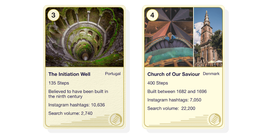In third place is Lisbon’s Initiation Well, situated in the hills near Portugal’s capital, followed by the Church of our Saviour in fourth, situated in Copenhagen, Denmark. The mysterious Initiation Well has 10,636 hashtags on Instagram and a search volume of 2,740. Meanwhile, the Church of our Saviour has a total of 7,050 hashtags a search volume of 22,200 and annual visitors of 80,000.