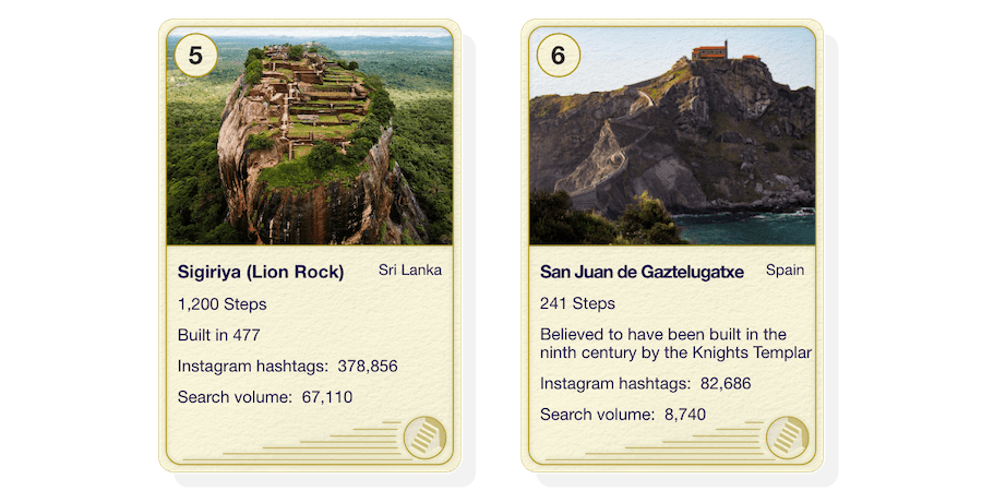 In fifth and sixth place are Sigiriya (Lion Rock) in Sri Lanka and the San Juan de Gaztelugatxe in Spain. The former counts 378,856 Instagram hashtags and a Google search volume of 67,100. The latter, meanwhile, ranks with 82,686 hashtags on Instagram and an annual search volume of 8,740.