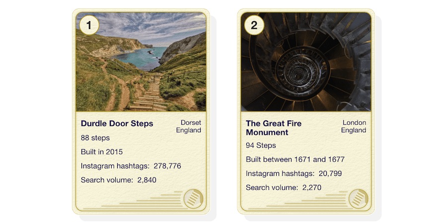 The Durdle Door Steps boast 278,776 Instagram hashtags along with an annual search volume of 2,840. And the Great Fire Monument has a total of 20,799 hashtags and a search volume of 2,270.