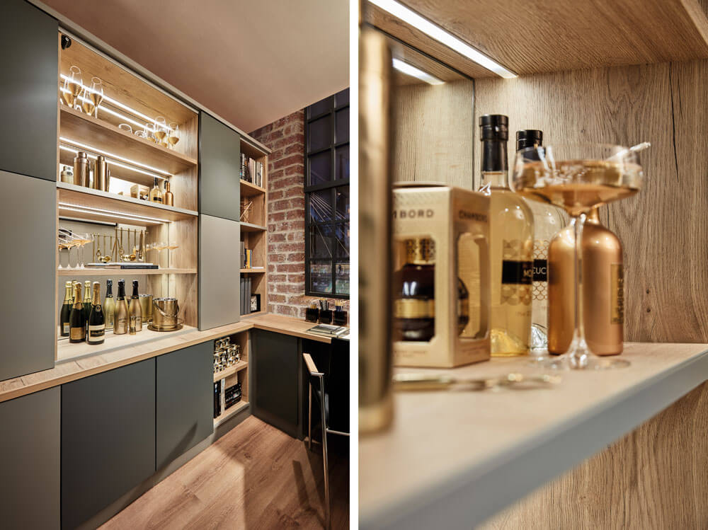 Imagine having your own personalised home bar? You could create it in your office, family area or even a corner of a sizeable hallway. It won’t have to be on display either. It can be a wonderful surprise for family and guests with discreet alcove shelving for your glasses and drinks. Mirrored back panels and strip lighting can also be used– all concealed within bespoke cabinetry. Ideal for unwinding at the end of the working day.