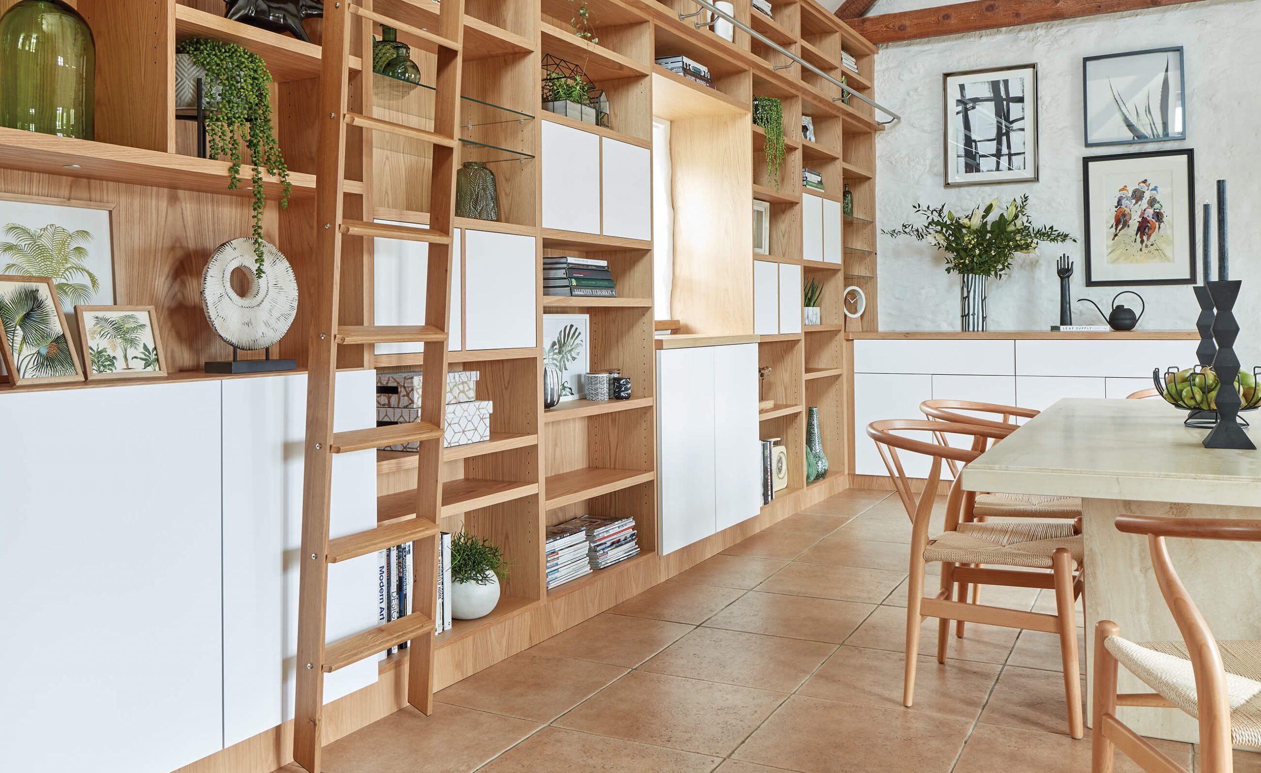 Clever storage is the key to successful open space living. Here in this stunning open lounge and dining area, our cleverly integrated wall shelving serves a variety of purposes – creating a real focal point to the room and providing plenty of space to display cherished items and hide away clutter. A great example of how an open space can be a hugely attractive asset for any home and is a great investment.