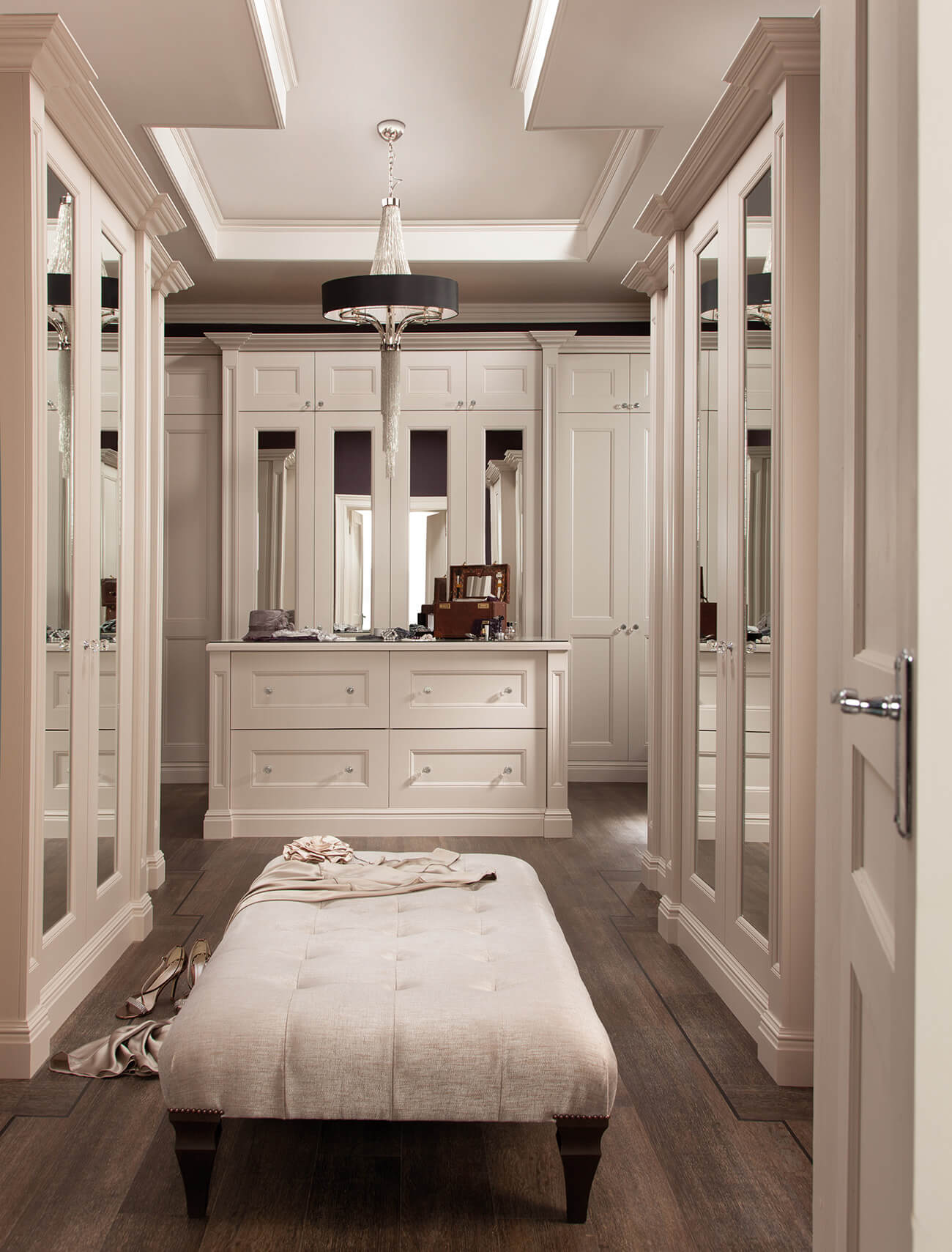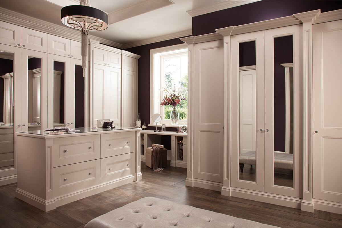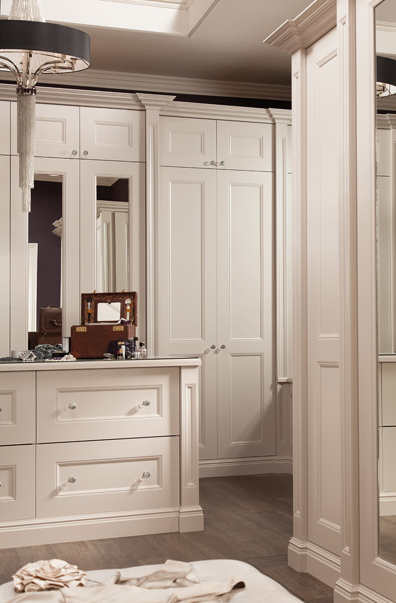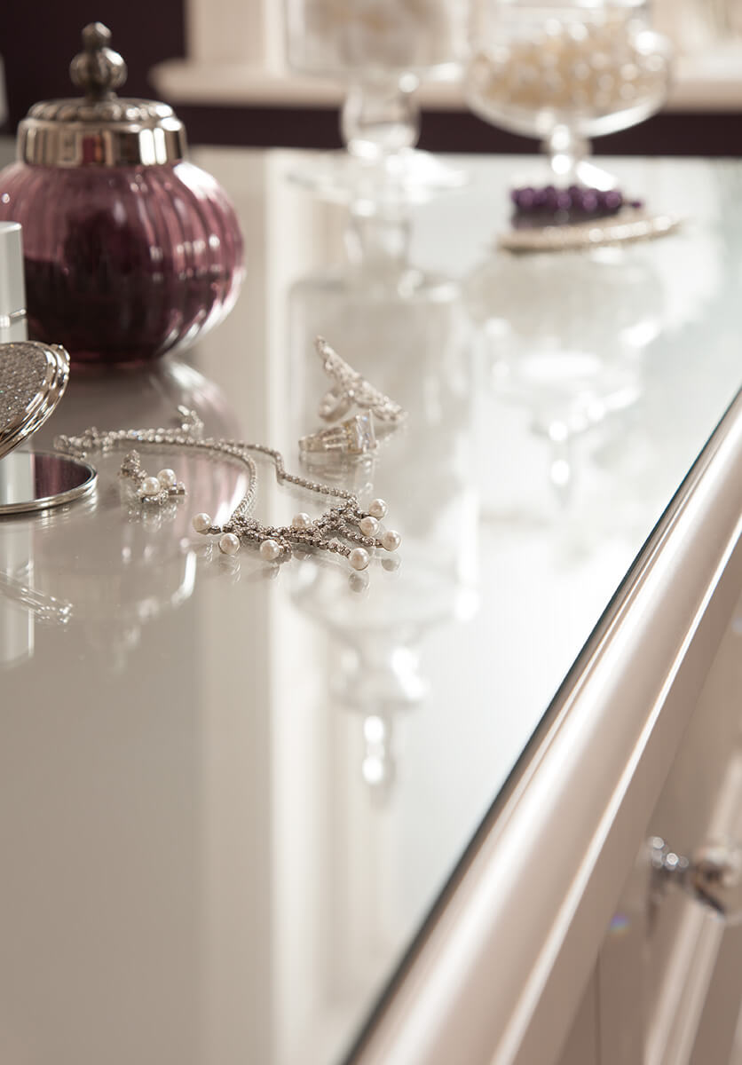 Extravagant details feature throughout to create a feeling of luxury. Every detail creates a feeling of opulence. The bespoke wardrobe and soft close drawers create not only a stylish finish, but a practical one too. Adjustable storage compartments neatly accommodate your precious items. Light colours and glass handles that shimmer, create a bright feel to the room. This stunning bedroom design comes in a range of colours and finishes, creating a solution that is unique to you.
