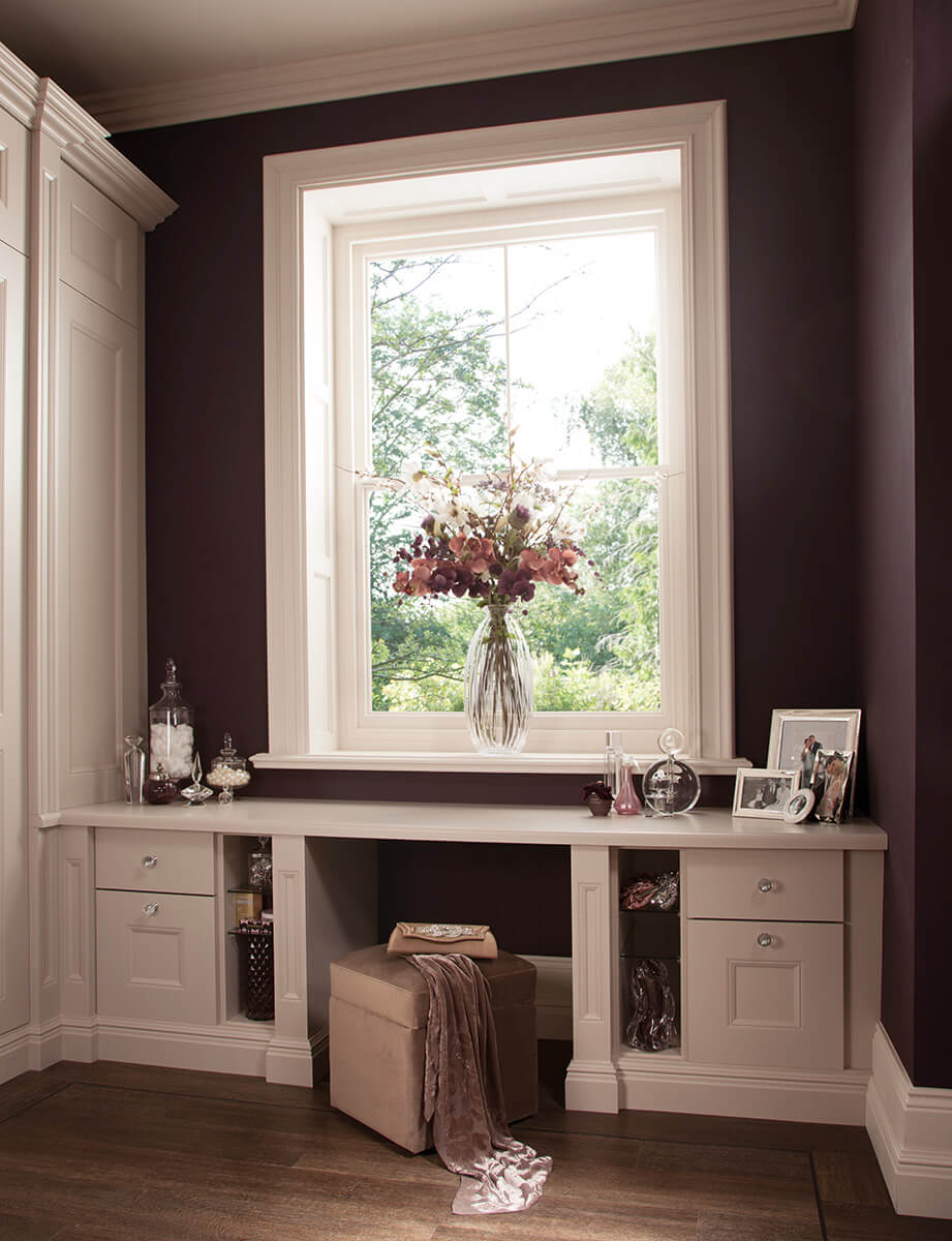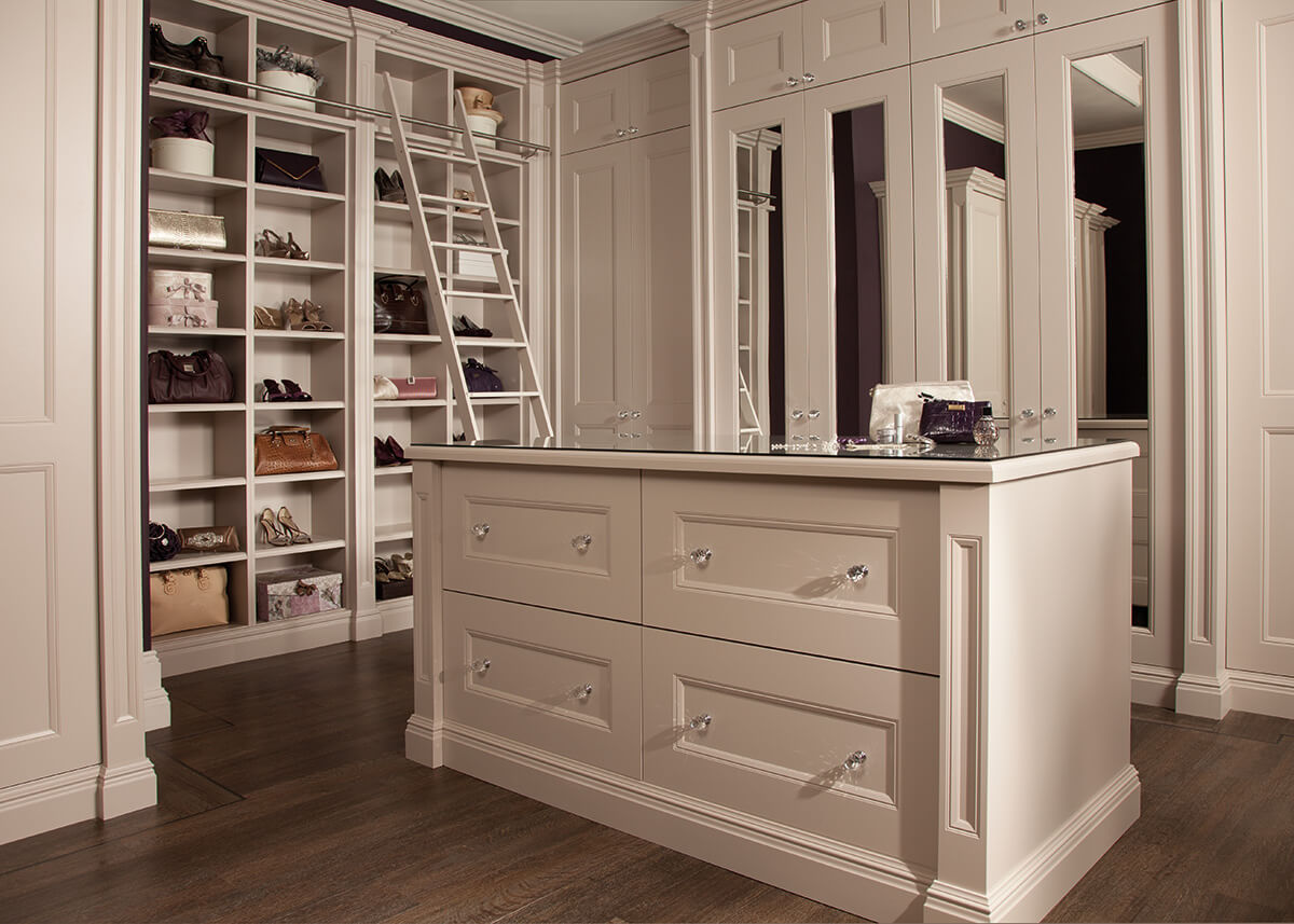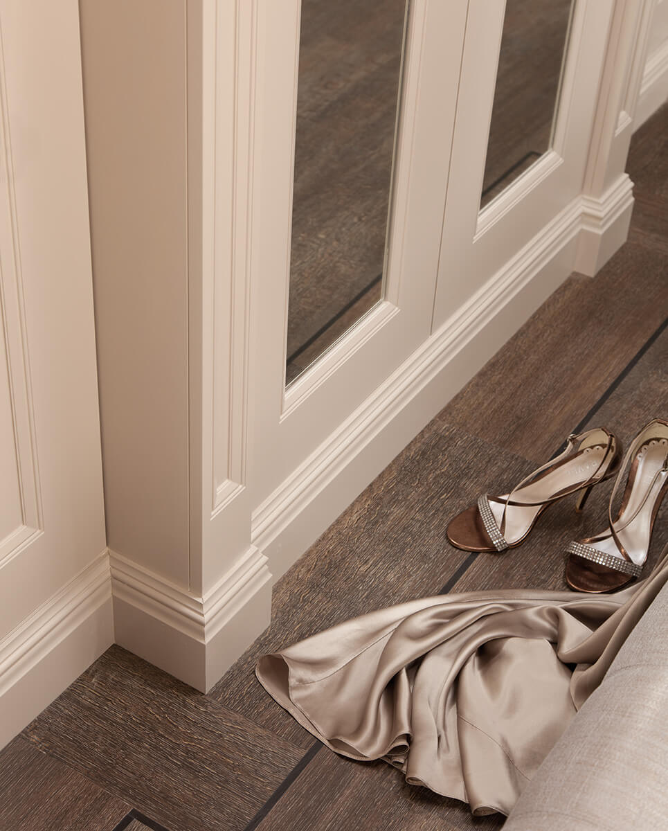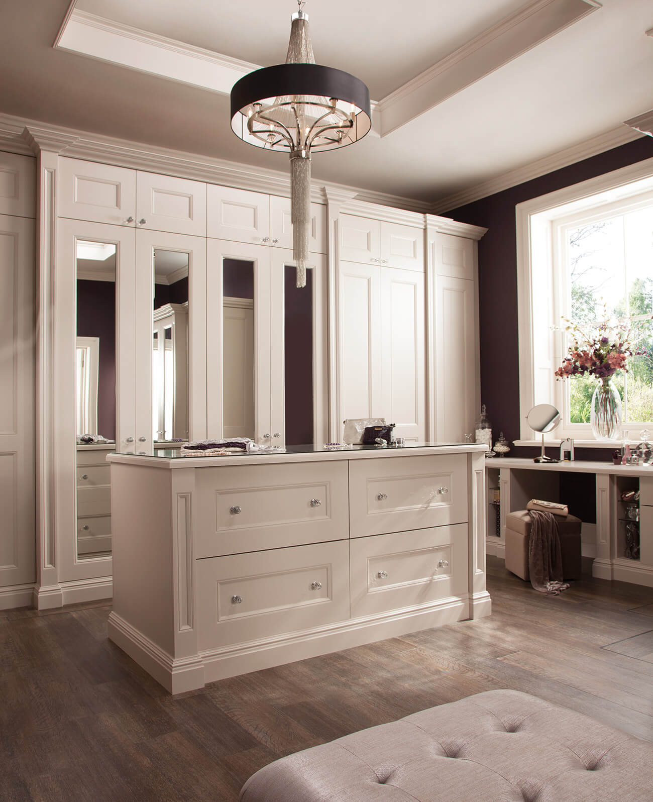 Extravagant details feature throughout to create a feeling of luxury. Every detail creates a feeling of opulence. The bespoke wardrobe and soft close drawers create not only a stylish finish, but a practical one too. Adjustable storage compartments neatly accommodate your precious items. Light colours and glass handles that shimmer, create a bright feel to the room. This stunning bedroom design comes in a range of colours and finishes, creating a solution that is unique to you.