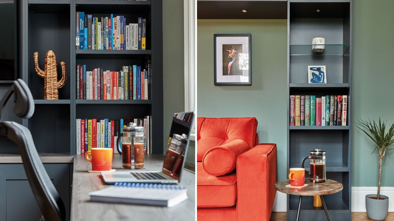 It might seem tempting to shy away from bold colour in a small space, but don’t be afraid to be daring! Here, because the furniture has been carefully planned not to dominate the room, the homeowner was able to choose a colour-loving scheme that combines the deep, rich Charcoal finish of the cabinetry with a restful sage green and a brave pop of bright orange to stunning effect.