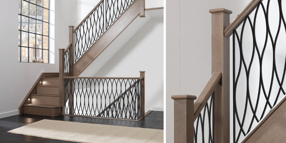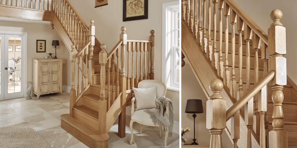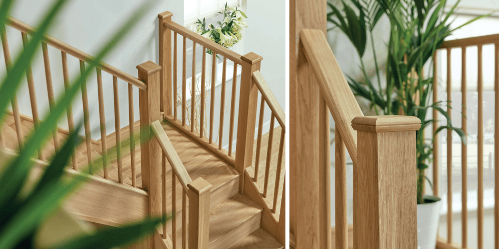 Wooden bannisters compliment these staircases thanks to their seamless continuation of the same colour and texture. Oak, timber, or walnut wood bannisters are a traditional choice, perfect for elegant home designs.